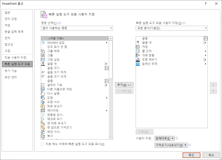 내 경우에는, 글꼴, 글자 색, 저장하기 (사실 저장하기는 ctrl+s 로 쉽게 할 수 있으므로 큰 필요는 없다.), 줄간격, 정렬, 채우기, 윤곽선 등의 기능을 빠른실행 도구모음으로 사용하고 있다.