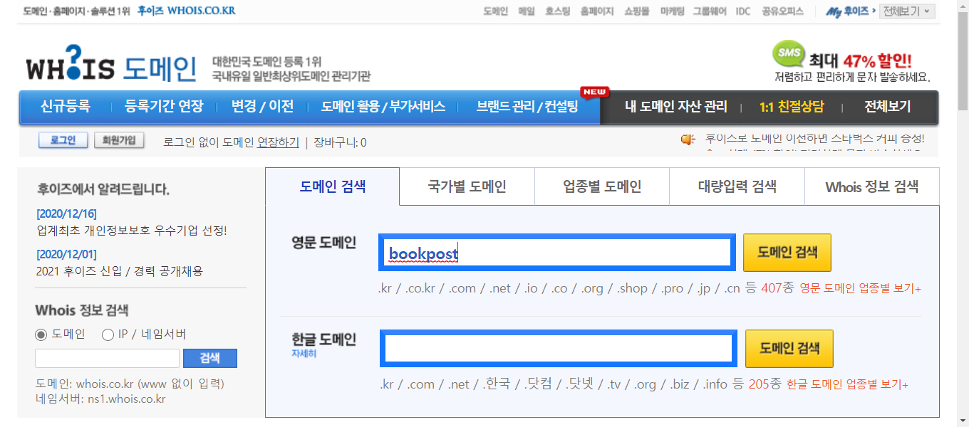 후이즈에서 도메인 등록하기