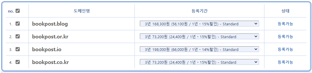 옛날에는 도메인 종류가 한정되어 있었던 걸로 기억하는데, 요즘은 정말 많아진 것 같다. 내가 탐났던 도메인은, .io, .blog, .tv, .me, .pro 등등이었다. 뭔가 예쁘고 기억하기도 쉬운 것 같아서.... 일단은 bookpost.kr 을 선택하기로 했다. 가지고 싶은 것 다 가지면 좋지만, 유지비도 만만치 않게 들고 있으니 일단은 한국 대표도메인인 kr 만 등록해 보기로 했다. 돈이 좀 더 생기면 다른 도메인도 등록해 보고 싶다.