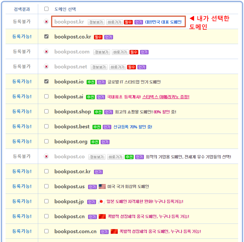 옛날에는 도메인 종류가 한정되어 있었던 걸로 기억하는데, 요즘은 정말 많아진 것 같다. 내가 탐났던 도메인은, .io, .blog, .tv, .me, .pro 등등이었다. 뭔가 예쁘고 기억하기도 쉬운 것 같아서.... 일단은 bookpost.kr 을 선택하기로 했다. 가지고 싶은 것 다 가지면 좋지만, 유지비도 만만치 않게 들고 있으니 일단은 한국 대표도메인인 kr 만 등록해 보기로 했다. 돈이 좀 더 생기면 다른 도메인도 등록해 보고 싶다.