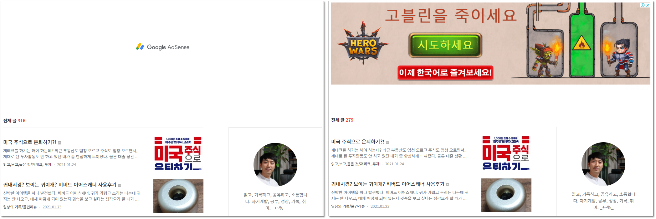 부도메인으로 애드센스 계정을 가입하니, 한 가지 문제가 있다. 부도메인으로 접속할 시에는 광고가 보이는데 (아래 그림의 우측), 티스토리 원 주소로 접속하면 구글 애드센스 자리로만 비어 있는 문제가 발생. 두 가지 경로로 들어오는 케이스가 모두 계실 텐데, 이렇게 되면.. 수익도 수익이지만 보기에 안 좋을 것 같아서 사이트 추가 신청을 해 두었다. 승인될지 거절될지 잘 모르겠는데, 결과가 나오면 다시 포스팅 할 예정....