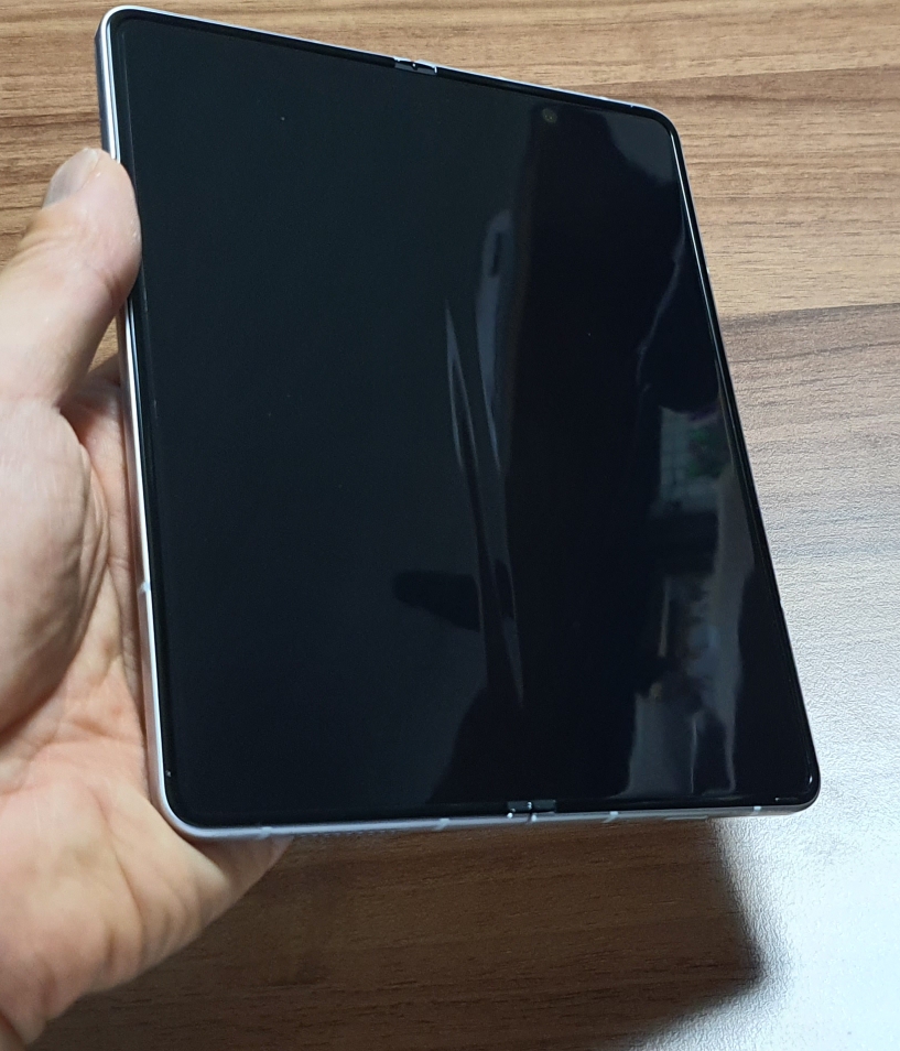 무게는 꽤 묵직했습니다. 제가 지금 사용하고 있는 갤럭시 노트 10 플러스가 196g 이고, Galaxy Z Fold 3 이 271g 이니, 기존의 휴대폰 대비해서는 압도적인 무게를 보여 주는군요. 최근 사용하던 주력 태블릿인 아이패드미니 5의 무게가 셀룰러 기준 308g 인 것을 생각해 보면, 폴드3의 무게는 휴대폰의 범주는 아니지요. 손에 들어 보면 기존 휴대폰 대비 묵직한 느낌이 듭니다. 지인 분들은 손목에 무리가 갈 것 같다는 평가도 하시는데, 저는 예전부터 태블릿 피씨를 손에 들고 사용하는 데 익숙해져 있기 때문에, Galaxy Z Fold3 정도면 귀여운 축에 속하지요. ^^