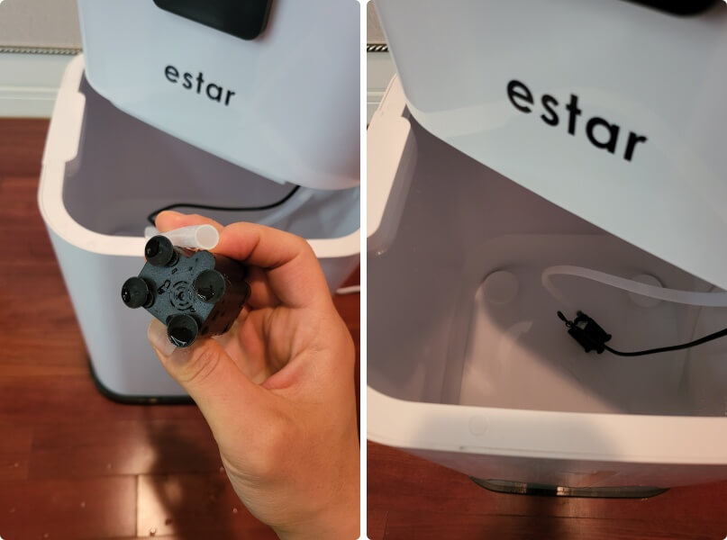 본체 아래쪽으로는 물탱크에서 물을 빨아들일 수 있도록 펌프와 호스가 길게 나와 있는데, 이 펌프를 빨판으로 물탱크 바닥에 부착해 주어야 합니다.