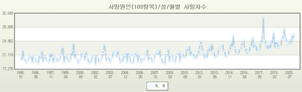 국가통계포털 (KOSIS.KR) 에 들어가서, "월별 사망"이라는 키워드로 검색을 해 보았습니다. 맨 위에 월별 사망자수 항목이 있네요. 1995년부터 2020년까지 통계가 작성되어 있다고 합니다.