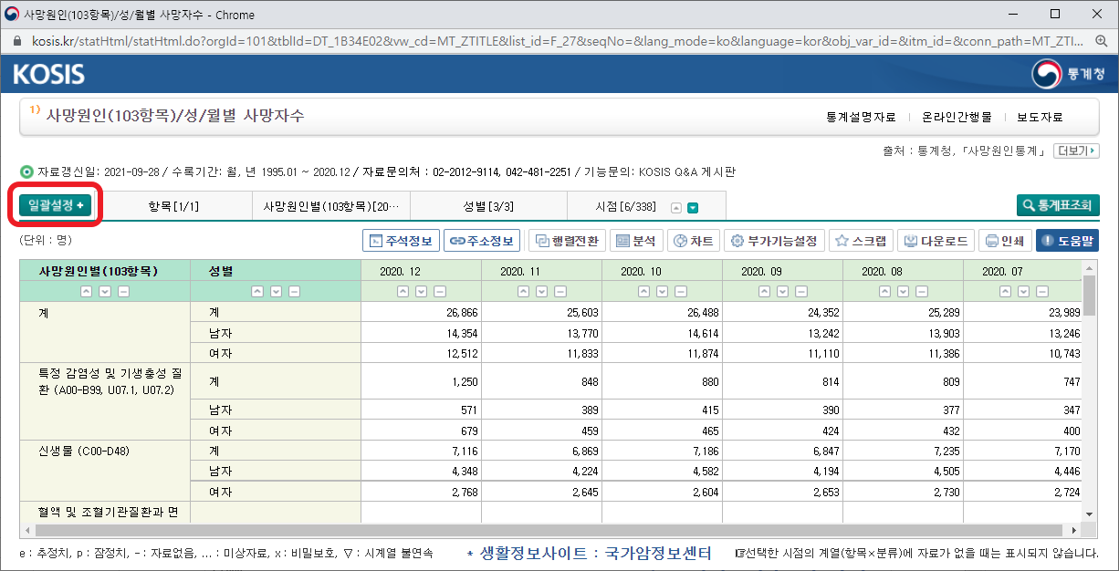 클릭을 해서 보니 사망 원인별, 월별, 성별로 통계표가 정리되어 있는 것을 알 수 있습니다. 왼쪽 위에 일괄 설정 버튼을 누르면 데이터를 세밀하게 선택할 수 있습니다. 세로축은 사망자 수만 선택할 수 있군요. 그 다음에 사망 원인별, 성별로 세부 분류를 선택할 수 있게 되어 있습니다. 저는 총 사망자 수만 볼 것이기 때문에 모두 "계"를 선택했습니다. 아래로 내려보면 시점을 선택할 수 있는데, 월별로 볼 것이기 때문에 "월"을 선택하고, 모든 날짜를 다 선택했습니다. 적용 버튼을 누르니 선택한 대로 표가 나오는군요.