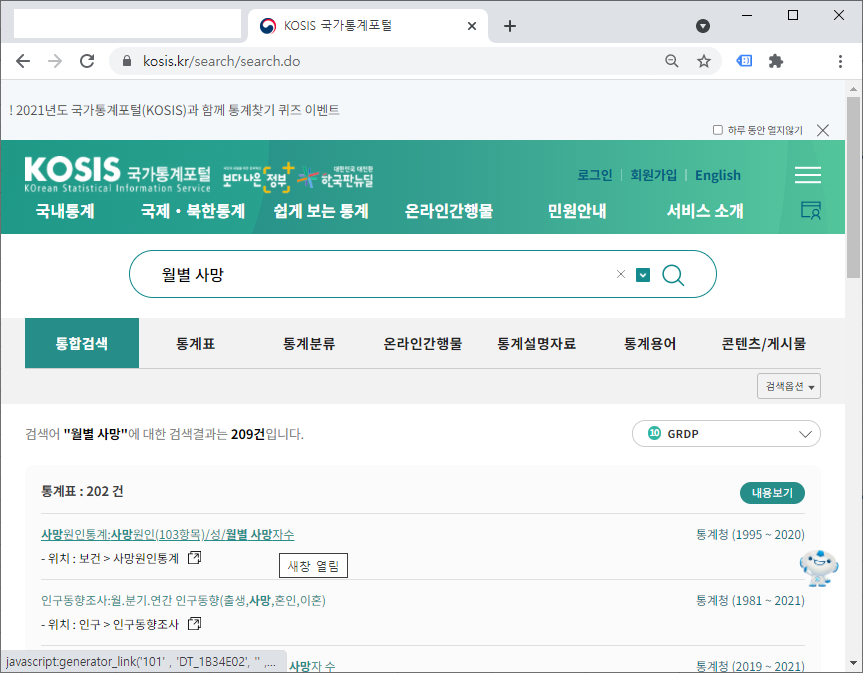 1. 국가통계포털 접속, 데이터 검색