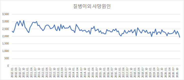 사망 원인에는 여러 가지가 있을 수 있겠지요. 질병 이외의 원인에서 혹시 계절적 패턴이 나타나는지 보기 위해서, 통계 항목에서 질병 외의 사망만 따로 뽑아 보았습니다. 사고나 극단적 선택 같은 것들이 포함되어 있는데요, 이 경우에는 계절적 패턴이 뚜렷이 보이지 않는다는 특징이 있었습니다. 즉, 월별 패턴을 보이는 사망원인은 대부분 질병이라고 볼 수 있겠군요. 연령별로 조회 했을 때 조금 더 뚜렷한 패턴이 나타날 것 같은데, 연령별로, 월별로 함께 정리해 놓은 통계표는 찾지 못했습니다.