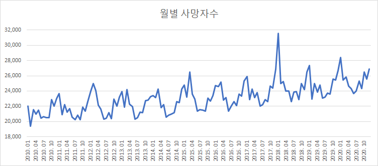 주위에서 간간이 부고 소식이 들려 오고 있습니다. 겨울철에는 부고가 많아진다는 속설이 있습니다. 이 속설이 사실인지는 모르겠지만, 회사에서 날아오는 부고 관련 이메일을 날짜별로 세어본 적이 있었는데, 봄~가을보다 겨울에 날아오는 부고 메일의 숫자가 더 많았습니다. 저뿐 아니라 다른 사람들도 이런 걸 체감하고 있더라고요. 겨울철에 사망자가 증가한다는 속설이 진짜인지 알아보기 위해서, 국가통계포털 사이트에 들어가서 데이터를 조회해 보았습니다.
