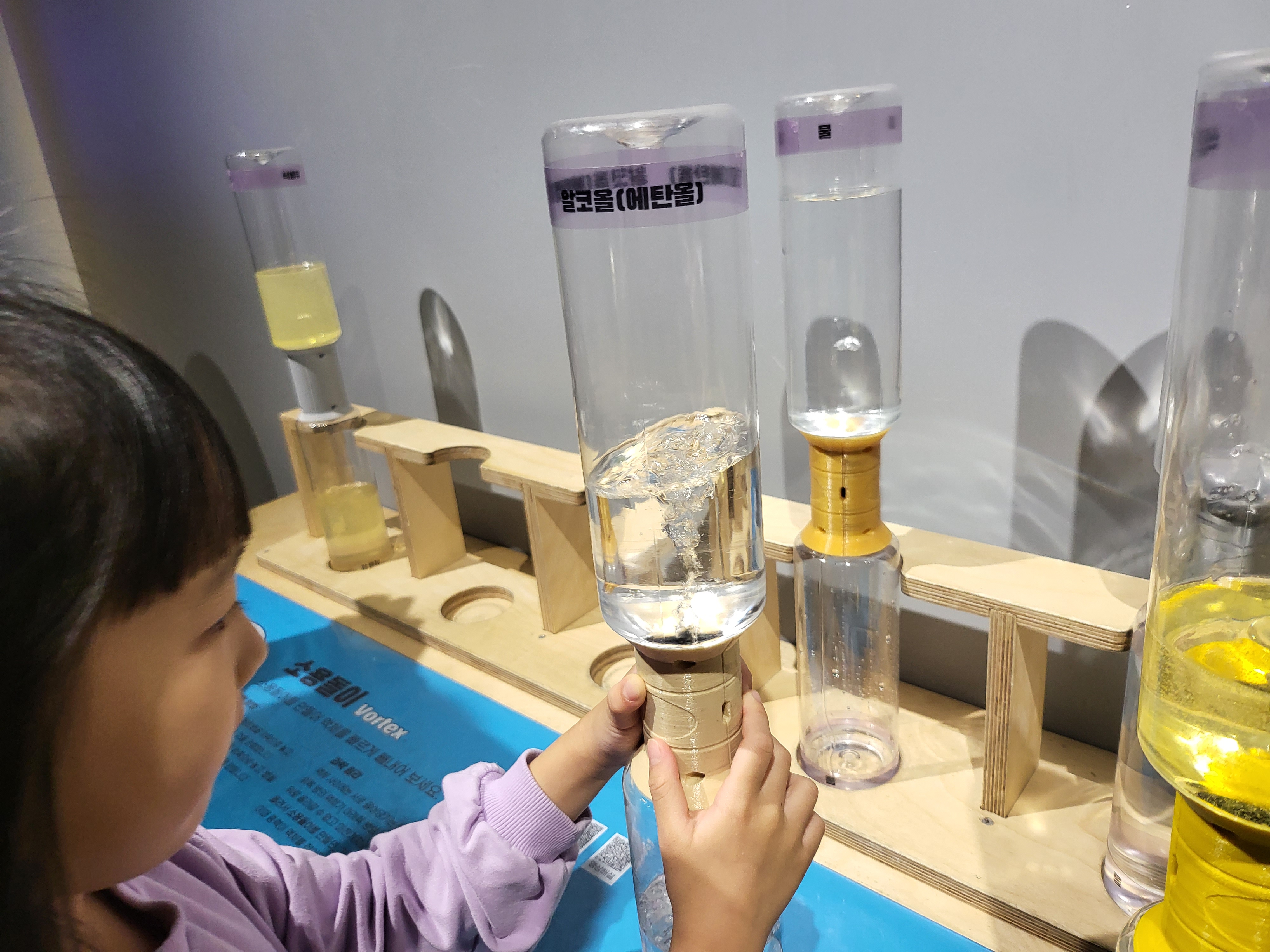 회오리 만들기 체험도 재밌었습니다. 모래시계 모양의 병에 액체를 반쯤 채워두고 뒤집으면 아래쪽에 있는 공기가 위로 올라갈 틈이 없어서 잘 흘러내리지 않죠. 회오리를 만들어서 내부에 작은 공기 구멍을 형성해 주면, 콸콸 쏟아집니다. 유체마다 표면 장력에 차이가 나서 쏟아지는 속도도 각각 다르죠.