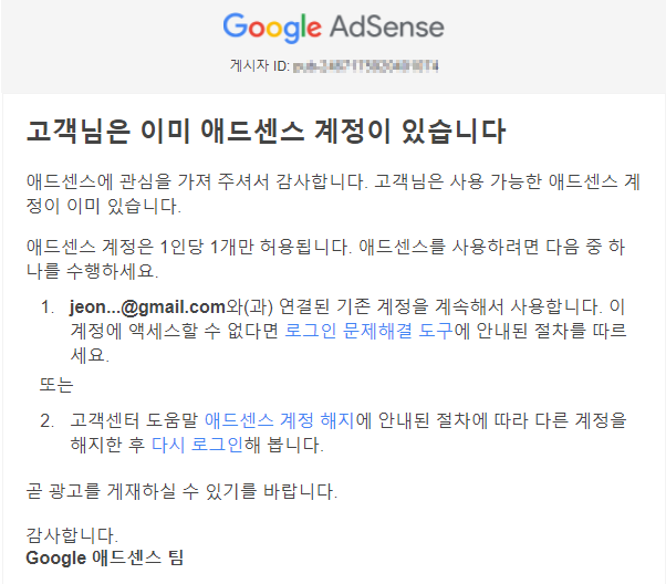하루 기다렸더니 바로 메일이 왔다! "고객님은 이미 애드센스 계정이 있습니다." 라고... 하기야, 구글이 바보가 아닌 이상 같은 사람에게 두 개 계정을 허용해 줄 리가 없겠지. 어쨌든 돌부처같이 묵묵부답이던 애드센스 느님한테 반응이 오다니 왠지 반가웠다.