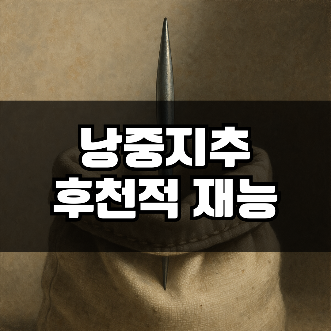 낭중지추(囊中之錐)는 '주머니 속의 송곳'이라는 뜻으로, 뛰어난 재능과 실력은 아무리 숨기려 해도 결국 드러나게 된다는 의미를 담고 있는 고사성어입니다. 이 표현은 사마천의 『사기(史記)』에서 유래했으며, 송곳처럼 뾰족한 재능은 주머니에 넣어두어도 그 날카로운 끝이 천을 뚫고 밖으로 드러나듯, 진정한 실력은 결국 세상에 알려지게 된다는 교훈을 전합니다.
