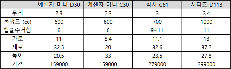 오리지널 기준으로, 네스프레소 커피머신은 네 가지 종류의 라인업이 나오고 있습니다. 에센자 미니 D30, 에센자 미니 C30, 픽시 C61, 시티즈 D113 이렇게요.