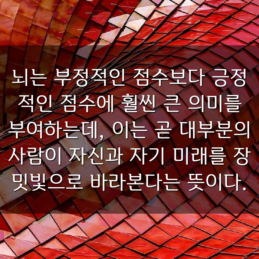 이러한 자신감의 특성은, 부정적인 상황에도 굴하지 않고 낙관적인 태도를 유지하게 하는 일종의 이유가 된다고 합니다. 이건 일종의 인지 왜곡이지만, 어쨌든 이런 특성 때문에 인류의 역사가 진보를 이루어 온 것도 사실이죠.