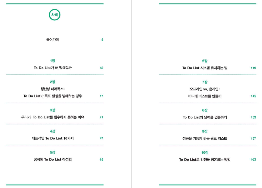 이 책은 총 10장으로 이루어져 있다. 왜 투두리스트가 필요한지 / 투두 리스트가 오히려 목표달성을 방해하는 우리는 왜 투두 리스트를 완수하지 못하는지, 잘못된 투두 리스트 사용법이란 무엇인지, 기존에 나와 있는 업무 관리 시스템의 장단점이 무엇인지를 면밀하게 분석하고, 저자가 제시하는 궁극의 투두 리스트 작성 및 활용법을 제시한다.