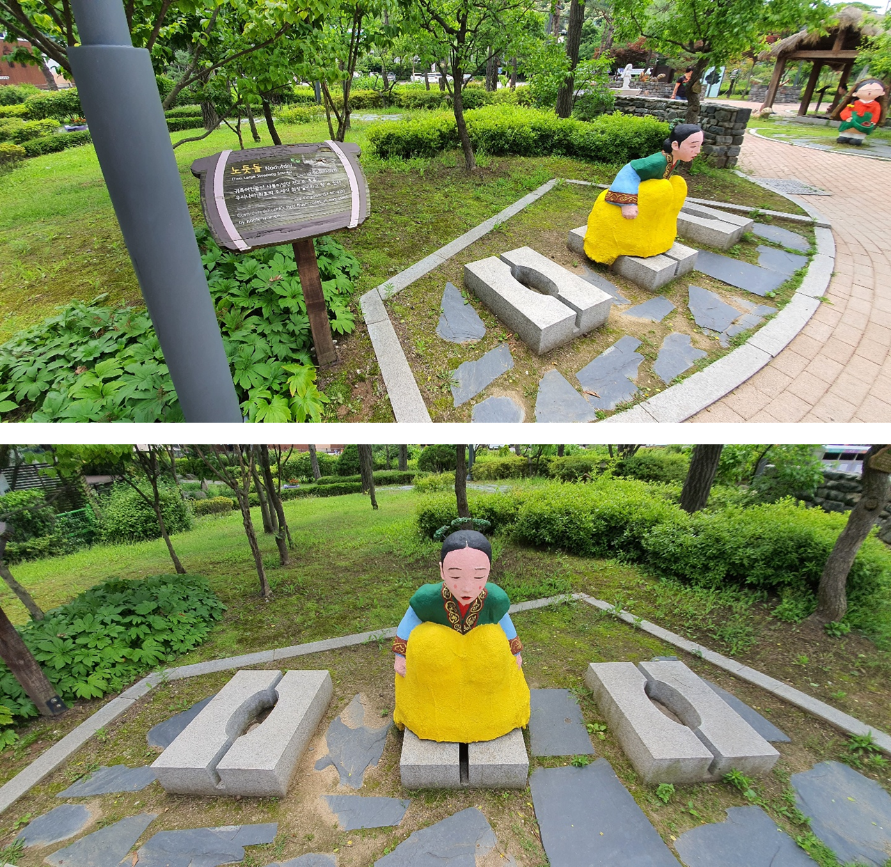 위 사진은 "노둣돌"입니다. 귀족여인들이 사용했던 우리나라 최초의 수세식 화장실이라고 하네요. 앞뒤로 수로가 설치되어 있네요. 반도체 용어로 Source 와 Drain 이 잘 갖추어진 것 같습니다. 수로가 너무 좁은 것 같은데 잘 내려갈까요?