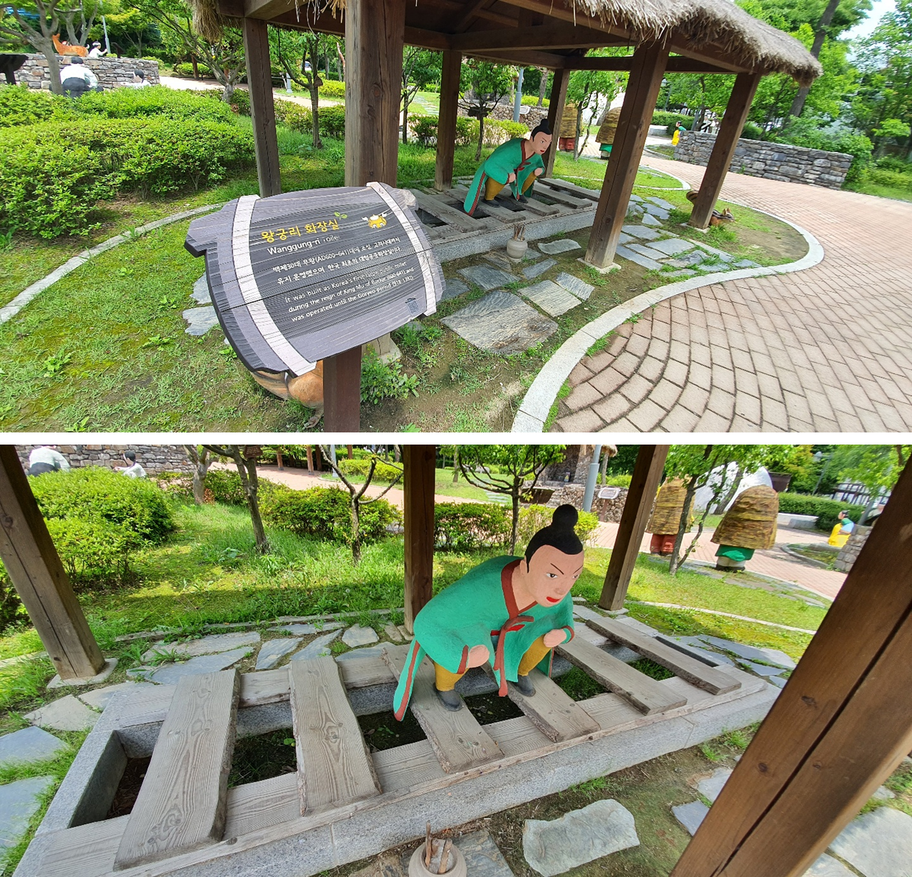 왕궁리 화장실이라고 해서, 백제 시대에 조성된 최초 대형 공중 화장실이었다고 합니다. 칸막이는 좀 있어야 할 거 같은데? 그리고 옷이 끌리고 있군요. 얼굴은 왜 표정이 ... 왜때문에 화가났나요?