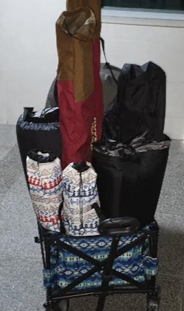 텐트 (왼쪽 큰 짐보따리) / 자충매트 두개 (오른쪽 폴라리스 로고) / 돗자리 / 전기랜턴 하나 / 가스랜턴 세개 / 랜턴걸이 / 롤테이블 / 간이의자 두개 (사진에서 인디안무늬로 된 가방) / 릴랙스의자 두개 (아래 빨간거)