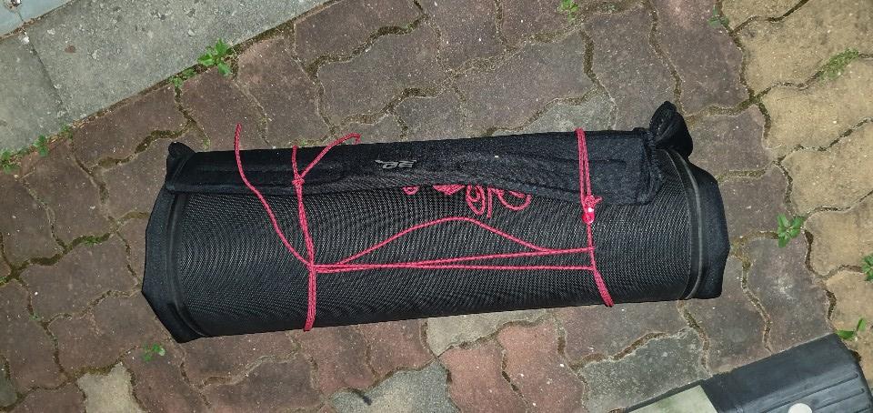 중고나라에서 15만원에 구매한 맥스파이더 6061L. 수납을 위해서 돌돌돌 말아서 묶어놓은 상태. 펼쳐 놓으면 꽤 많은 양이 들어간다. 수납용 가방이 없는 상태라서 (별매- Sold Out) 일단 텐트 스트링으로 허접하게 묶음.