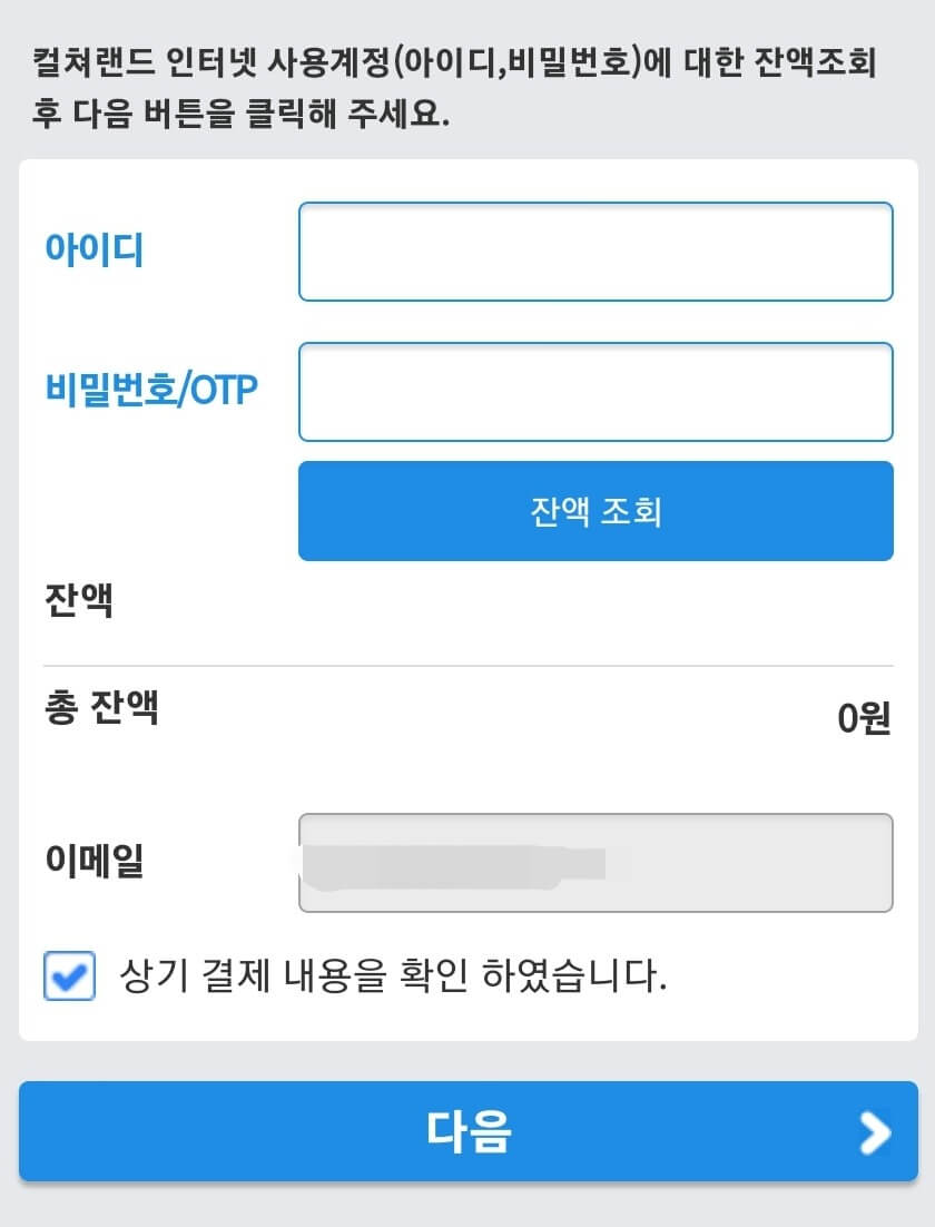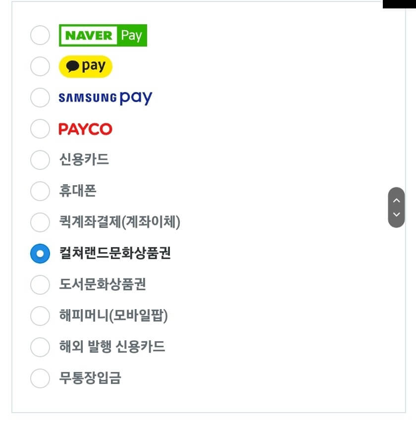 - 원하는 금액을 누르고, 결제수단에서 컬처랜드 상품권을 클릭합니다.