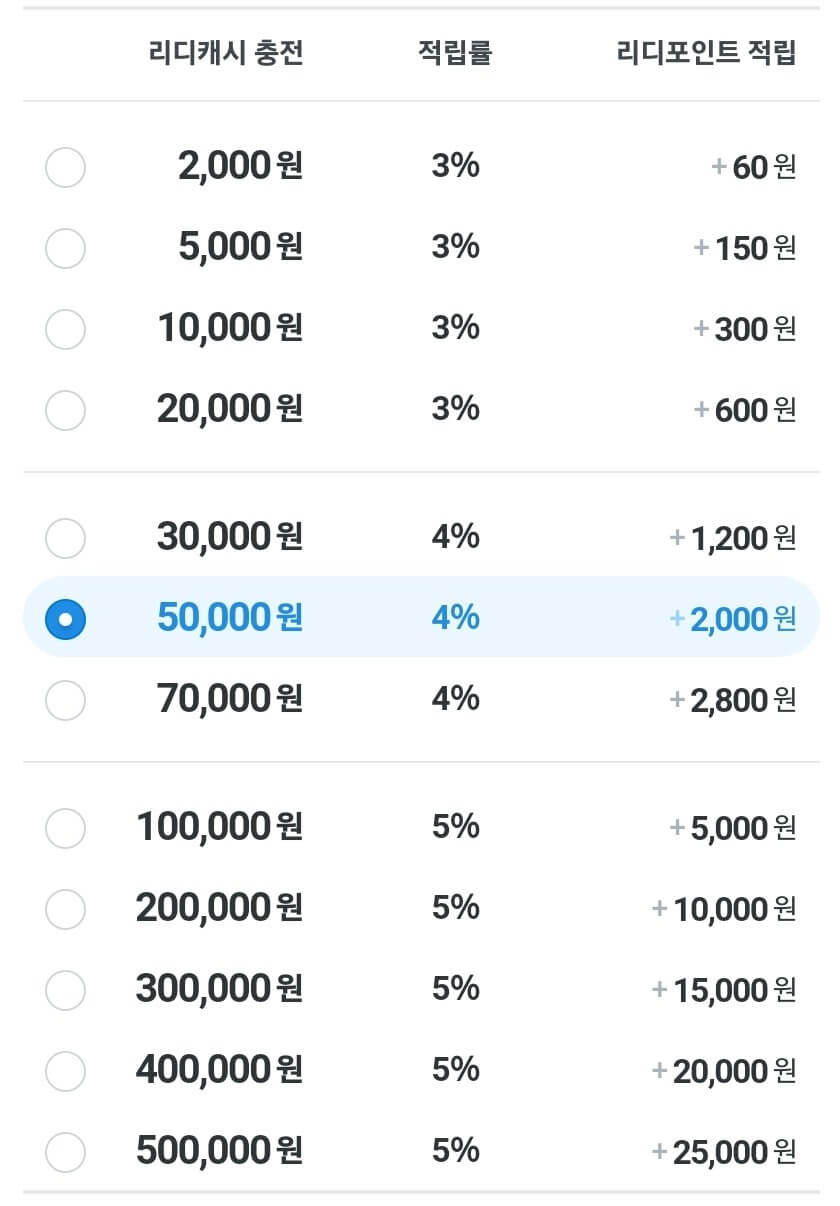 - 리디북스에서 미리 리디캐시를 구입하면 구매 금액에 따라서 추가적인 포인트 적립을 해 줍니다. 20,000원까지는 충전 금액의 3%, 70,000원까지는 충전금액의 4%, 그 이상 충전하면 5%를 적립해 주는군요. 5만원 충전을 하면 2,000원의 포인트를 추가로 받을 수 있는 셈이지요.