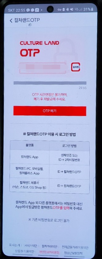 - 컬처랜드 앱에서 "OTP" 를 등록할 수 있습니다. 컬처랜드 제휴몰에서 사용할 일이 있을 때마다 앱에서 OTP를 발급받으면, 컬처랜드 캐쉬를 쉽게 사용할 수 있어요.