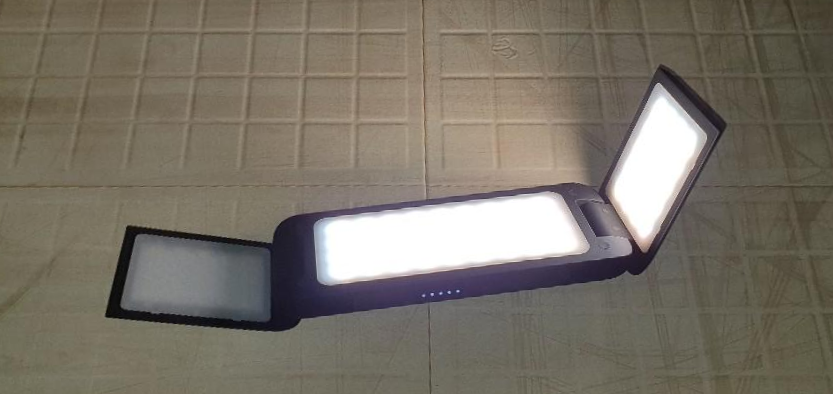 측면뷰. USB 타입 Output Port 가 있다. 보조배터리로 사용 가능하다. 그 옆에는 5핀 타입 충전포트 (Input) 그 옆에는 배터리 잔량을 표시해주는 LED, 파워버튼, 좌우 밝기 조절버튼, 그리고 모드 (색온도) 조절 버튼이 있다.