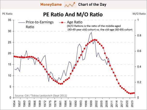 Mike Maloney shows how the P/E Ratio is correlated to the M/O Ratio. The M/O ratio is the ratio of the middle-aged (40-49 year old) cohort...
