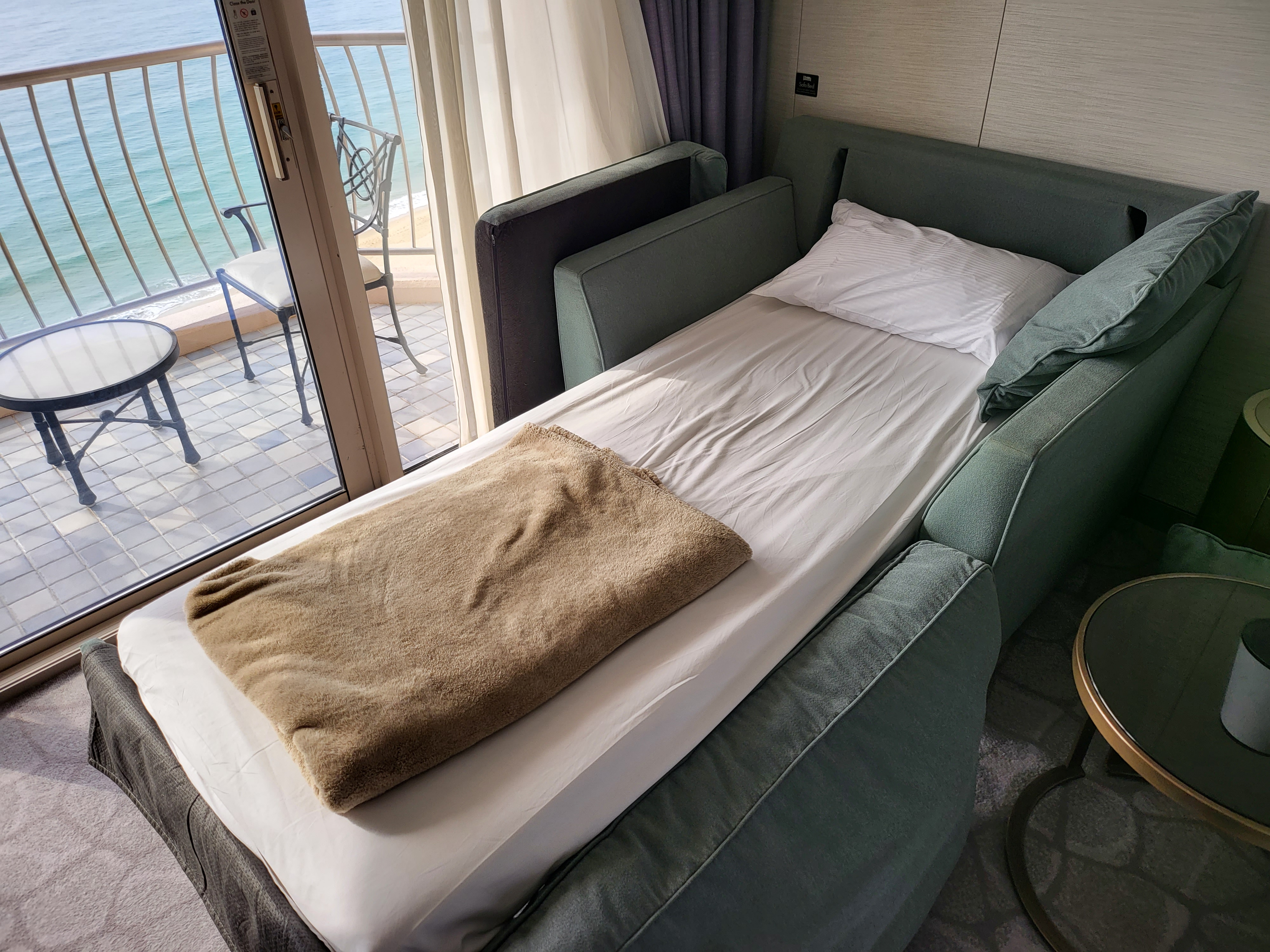 객실내에 비치된 소파는 접이식 침대였습니다. 펼치면 위 사진처럼 1인용 침대로 변하는 방식이죠.