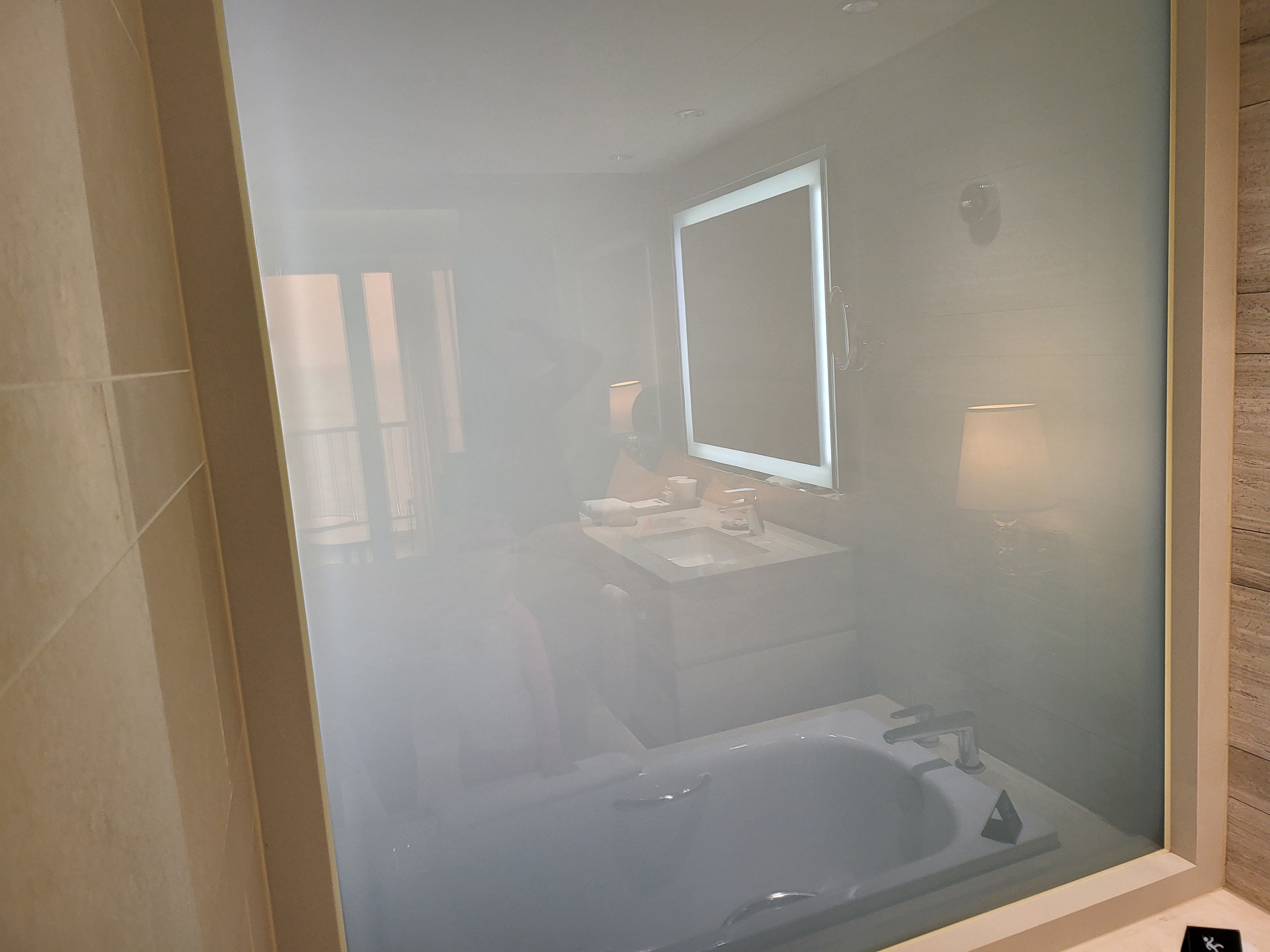 욕실은 세면대를 중심으로 욕조와 샤워 부스로 나누어져 있었습니다. 욕조와 침실을 가르는 창이 있었는데, 특수 유리로 제작되어 투명도를 스위치로 조절할 수 있더라고요.