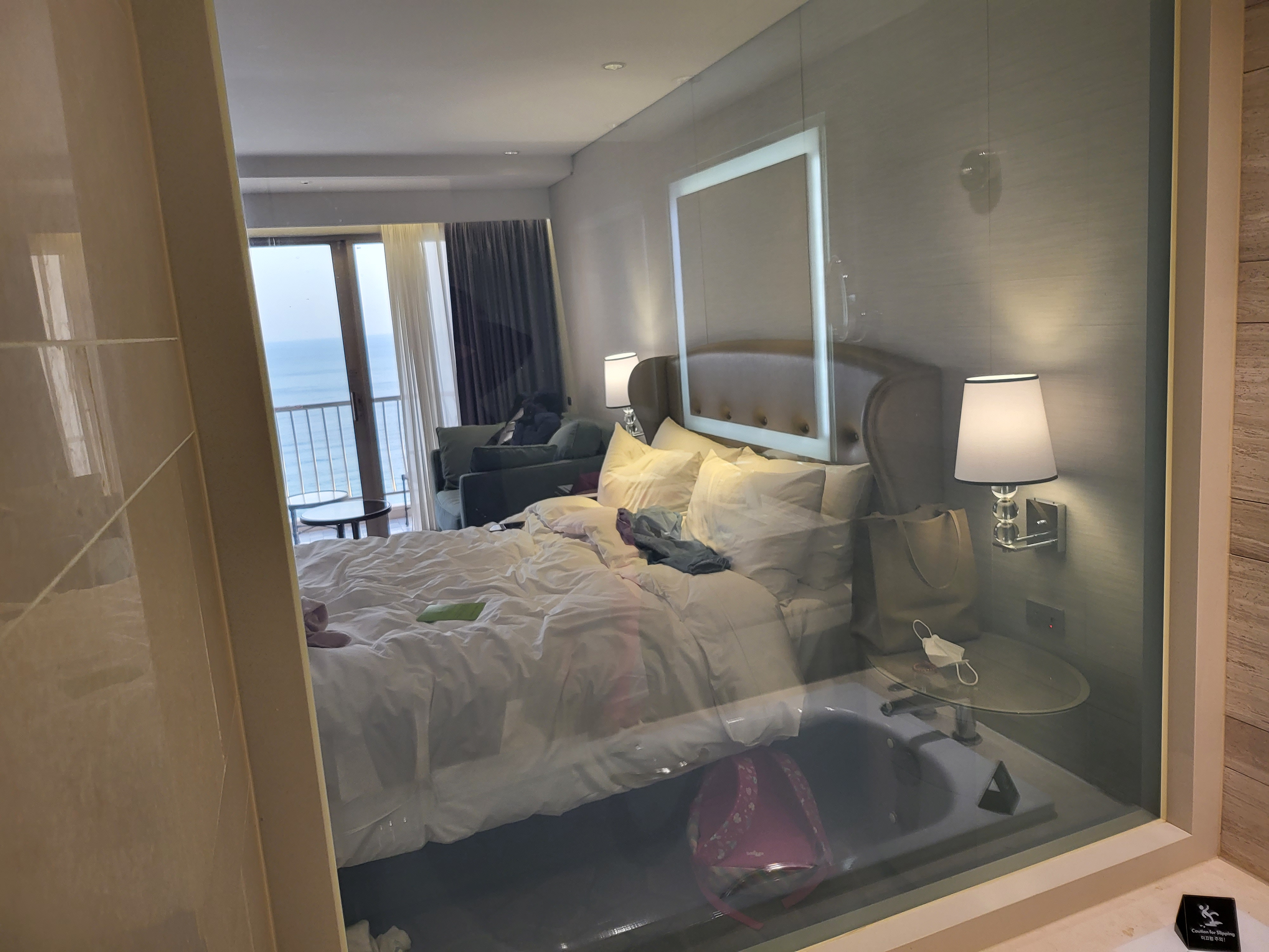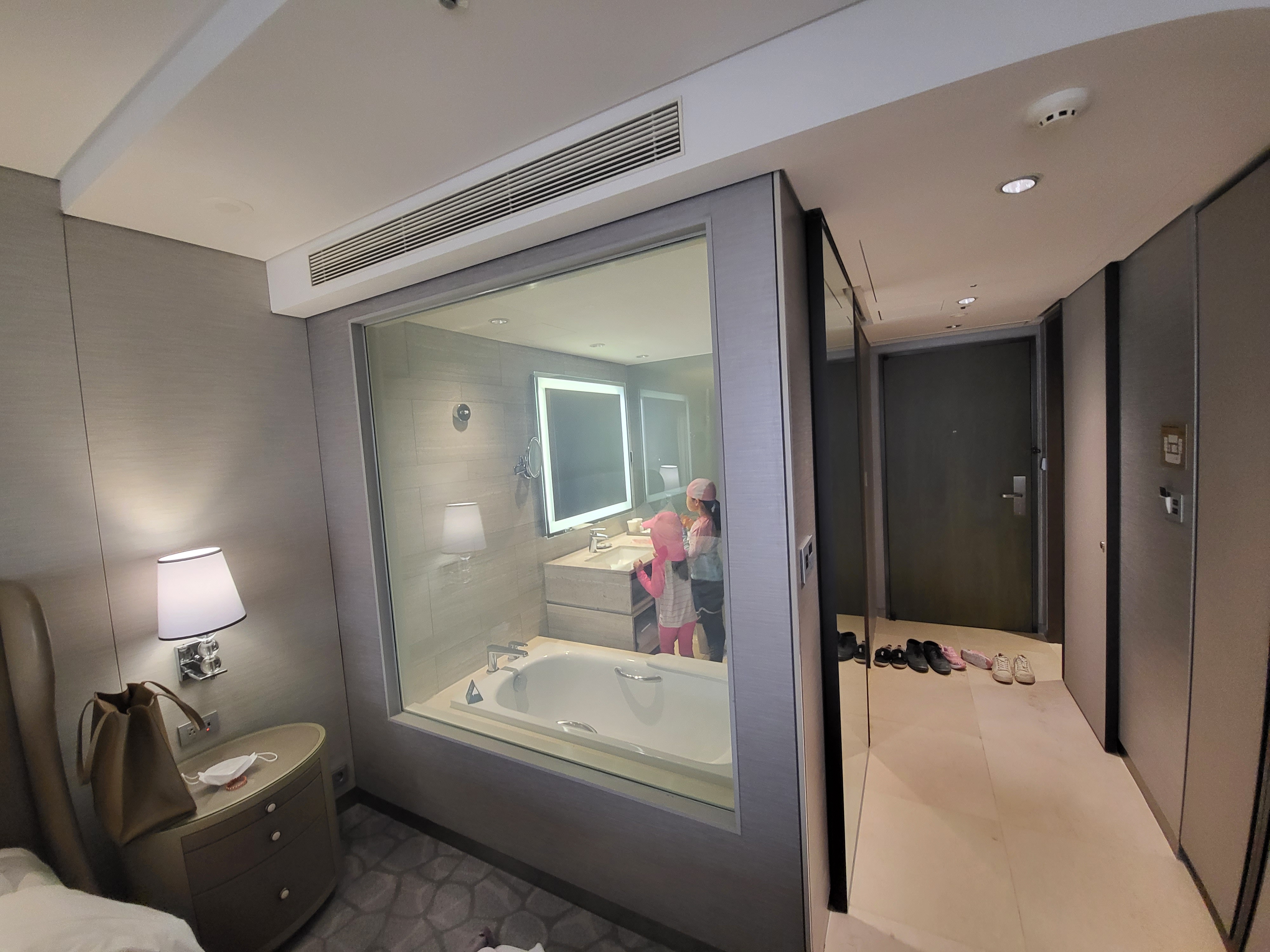 욕실은 세면대를 중심으로 욕조와 샤워 부스로 나누어져 있었습니다. 욕조와 침실을 가르는 창이 있었는데, 특수 유리로 제작되어 투명도를 스위치로 조절할 수 있더라고요.