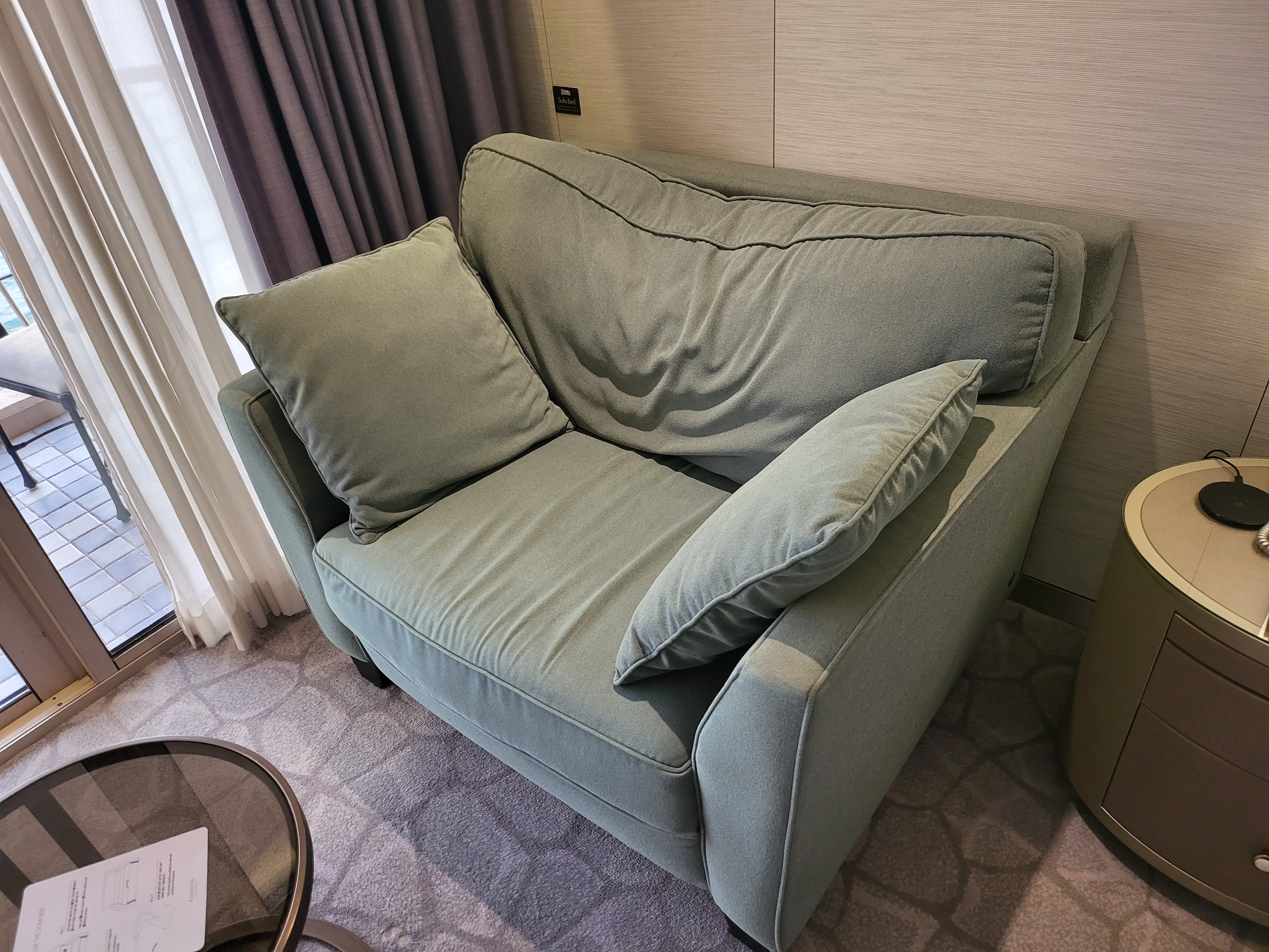 객실내에 비치된 소파는 접이식 침대였습니다. 펼치면 위 사진처럼 1인용 침대로 변하는 방식이죠.