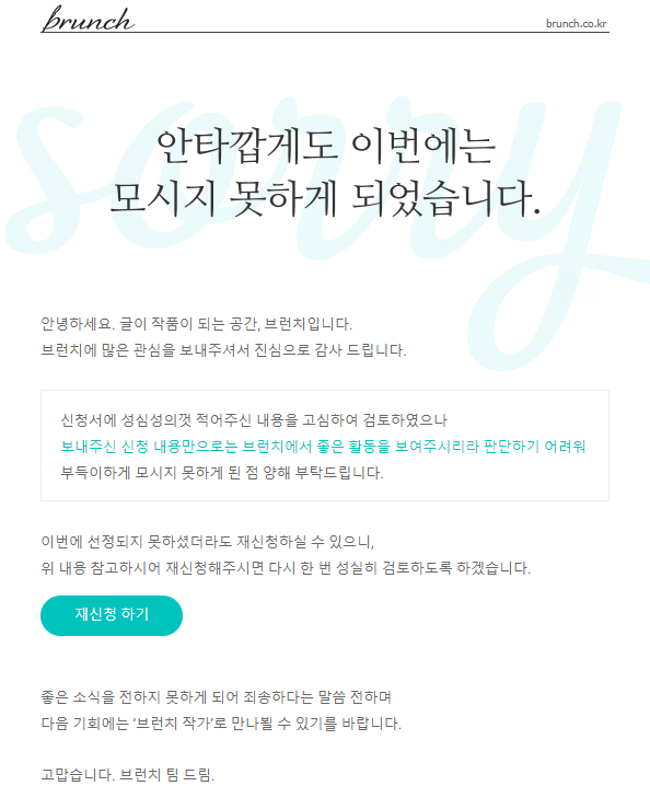 열번 넘게 도전하신 끝에 되신 분들도 계신 마당에, 두 번 도전하고 어렵다고 포기하는 건 너무 이르겠죠. ^^ 불합격 메일 받는 건 좀 속상하긴 한데, 그래도 계속 도전해 보아야겠습니다. 유튜브나 블로그에 보니까 브런치 작가 되는 여러 가지 팁들이 있더라구요. 어떤 요소가 합격에 중요한 요소가 되는지 공개되지 않고 있으니 확실한 것은 없겠지만, 그래도 많은 선배님들(?)의 조언을 참고하면서 계속 도전해 보아야겠습니다. 글도 계속 쓰고요.