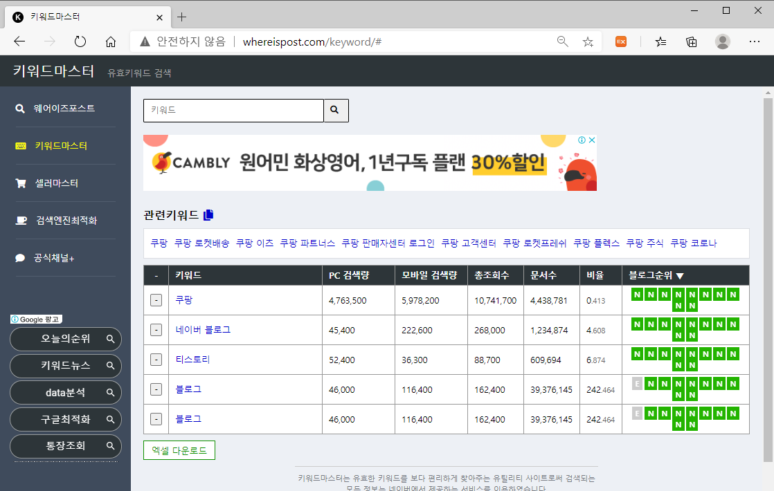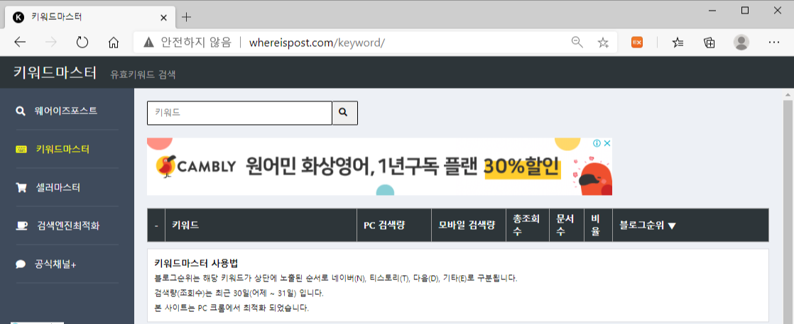 그리고 좌측 메뉴에서 "키워드마스터"를 클릭하면 키워드를 분석할 수 있는 툴이 나온다.