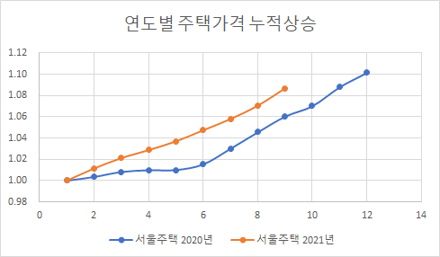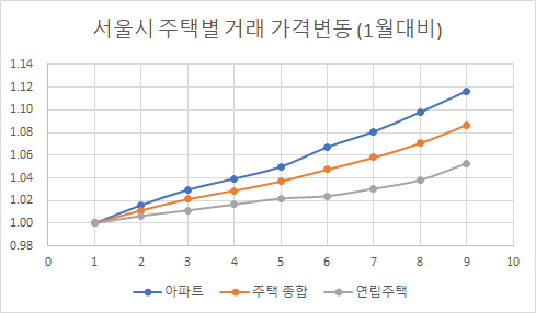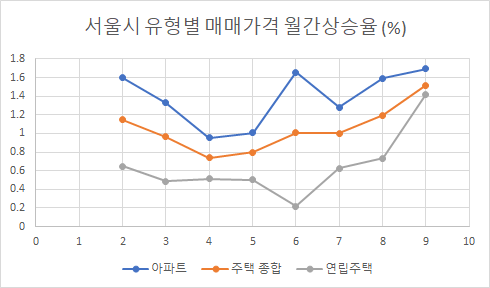 제가 월간 통계 보도자료를 직접 보았습니다. 서울의 9월 주택가격 상승율은 1.52% 인데 (주황색 선), 4월까지 상승율이 둔화되다가 5월부터는 지속적으로 올라가고 있는 추세입니다. 아파트 역시 9월 상승율이 최고를 찍고 있군요. 주택 가격이 하락한 적은 없었습니다.