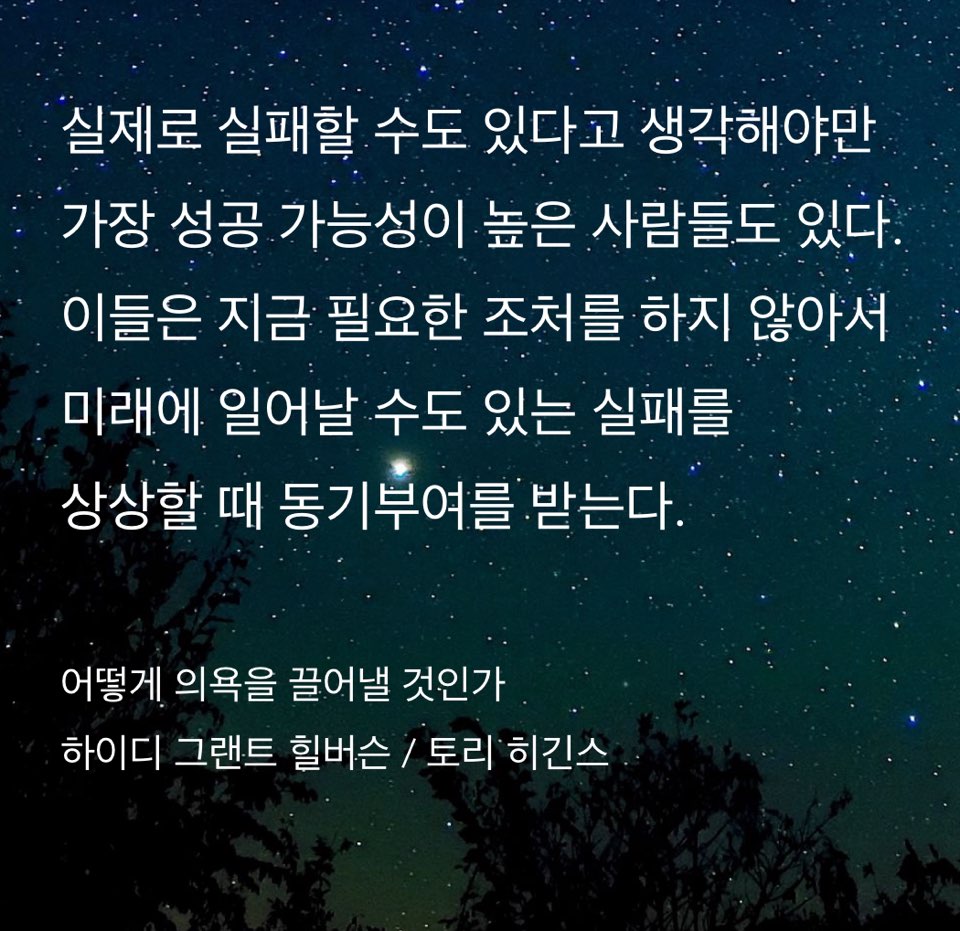 실제로 실패할 수도 있다고 생각해야만 가장 성공 가능성이 높은 사람들도 있다. (중략) 이들은 지금 필요한 조처를 하지 않아서 미래에 일어날 수도 있는 실패를 상상할 때 동기부여를 받는다.
