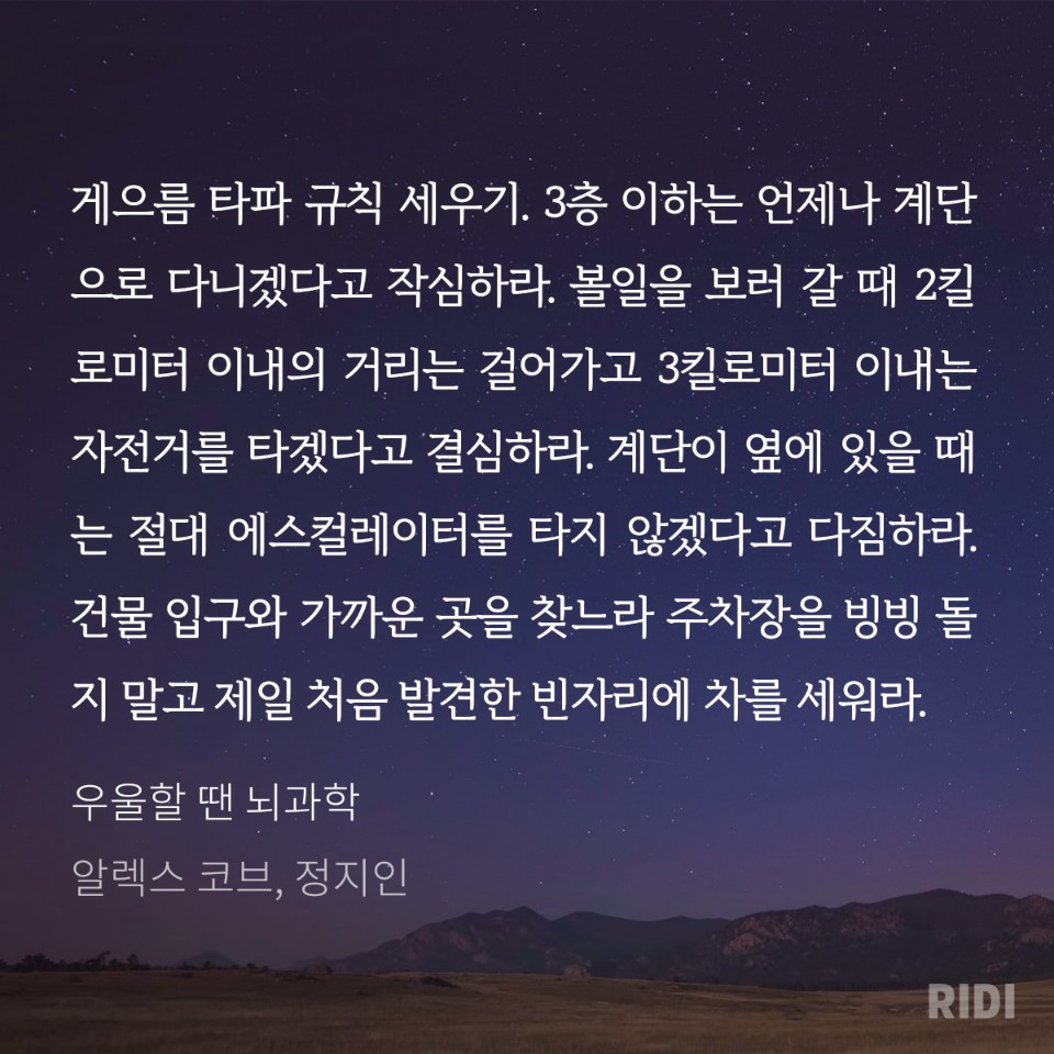 운동을 하면 뇌 건강에 좋다는 것을 막연히 알고는 있었는데 어떤 과정과 메커니즘을 통해서 좋아지는지는 잘 몰랐다. 이 책을 보니 운동이 생각 외로 유익하고 정신 건강과 집중력과 우울증에도 유용하다는 것을 알게 되었다. 운동이라고 해서 강도 높은 근력 운동이나 등산, 또는 구기종목을 하겠다는 것은 아니고, 생활 속에서 몸을 움직일 수 있는 기회를 많이 가지는 것부터 시작해야 되겠다. 출근할 때는 자전거를 꼭 타고 계단은 반드시 걸어서 올라가야겠다.