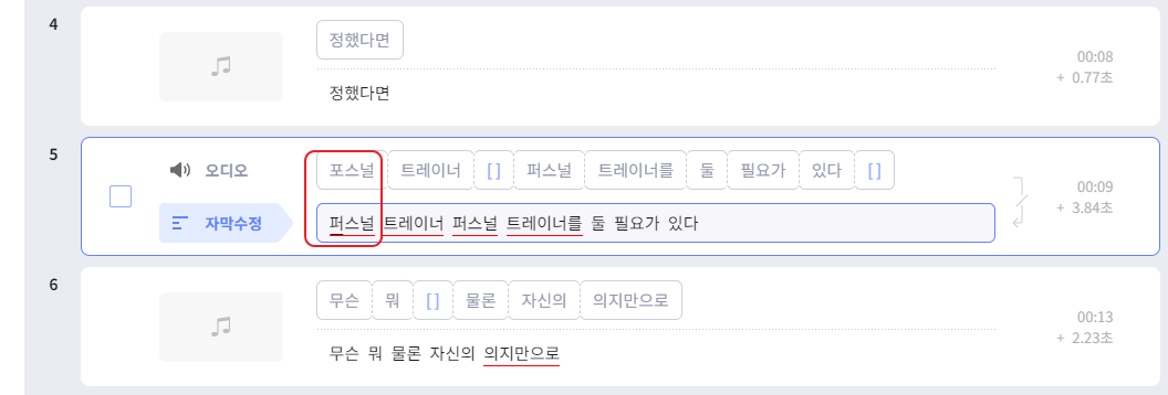 음성을 인식해서 자동으로 자막을 형성해 주기 때문에, 프리미어에서 작업했다면 상당한 시간과 노력이 필요했을 자막 작업도 꽤 쉽게 할 수 있습니다. 자막을 나눌 구간도 줄 바꿈으로 설정할 수 있습니다. 그리고 잘못 인식된 자막은 직접 수정할 수도 있구요. 이렇게 해 놓으면 바로 음성과 영상 자막 작업이 끝나니까, 제 경우에는 이 상태에서 각 자막 줄마다 넣을 이미지만 붙이면 영상이 만들어지게 됩니다.