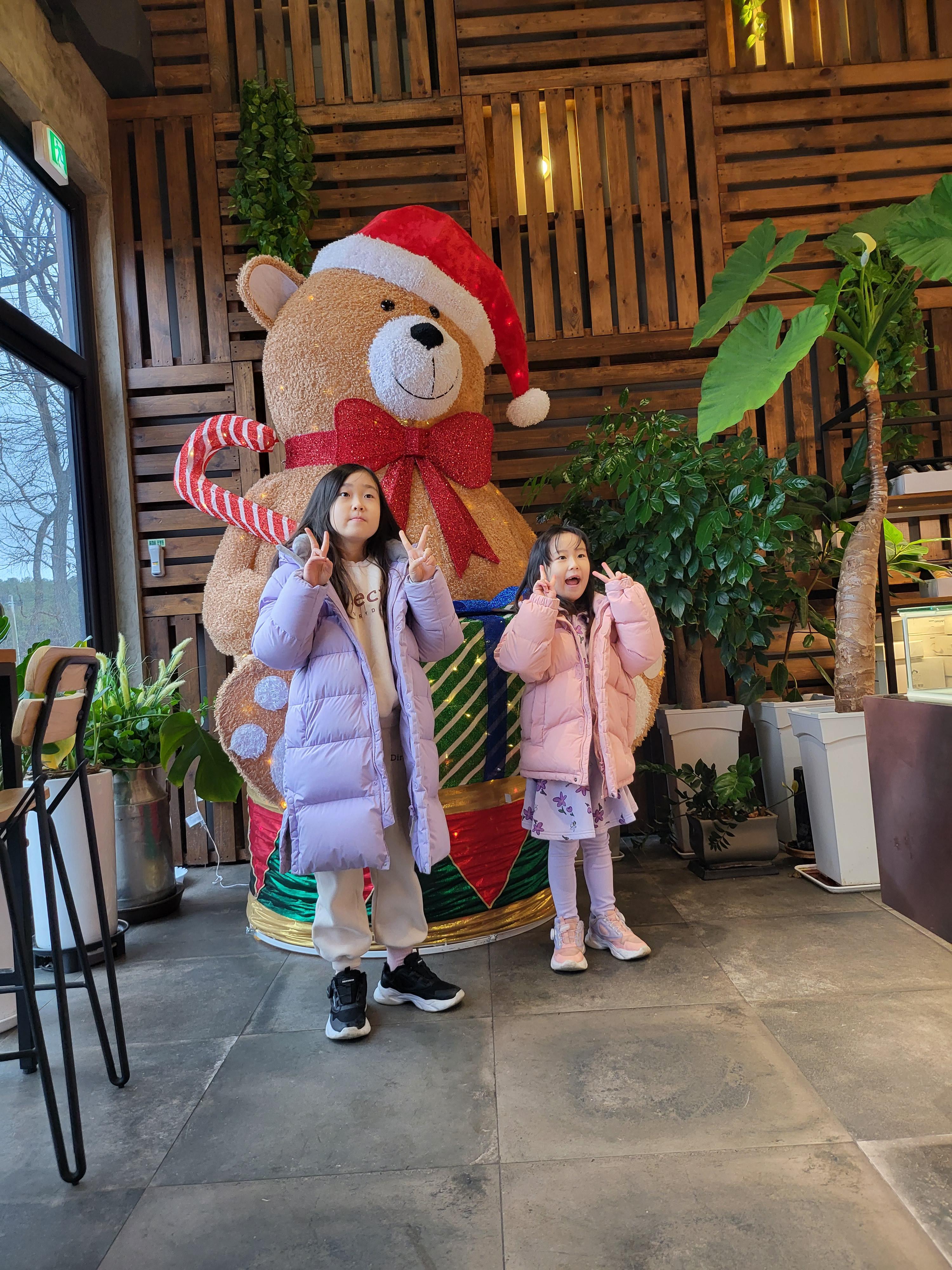 크리스마스는 지나갔지만, 거대한 곰돌이인형에 산타 모자를 씌워놓아서 아이들이 좋아하네요. 곳곳에 화초도 있고, 나무소쟈로 인테리어를 해 놓아서 따뜻한 느낌입니다.