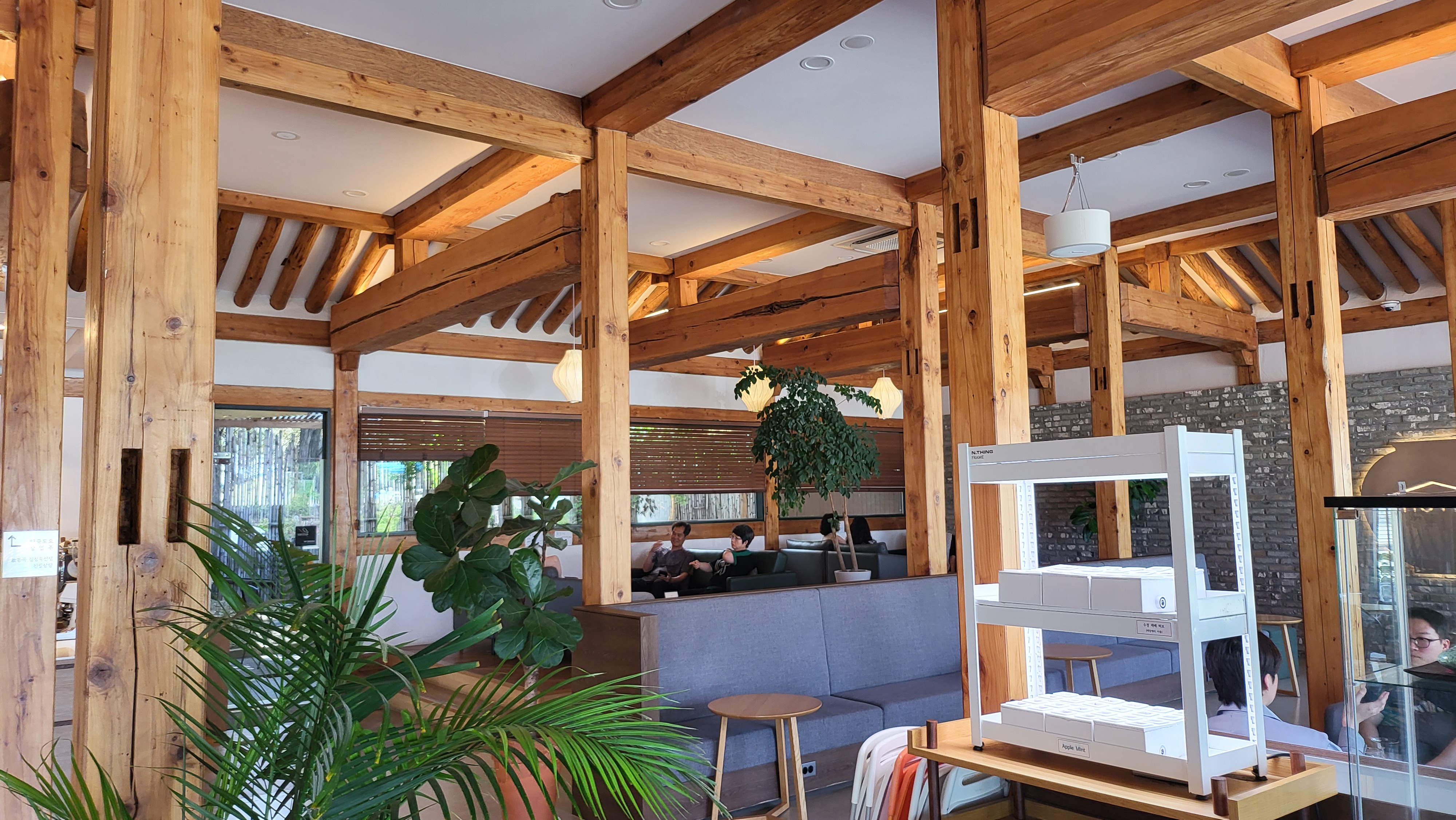 한옥 스타일의 대형 카페인데 내부가 꽤 넓고, 통유리 구조로 탁 트여 있어서 시각적으로도 시원해 보이더라고요.