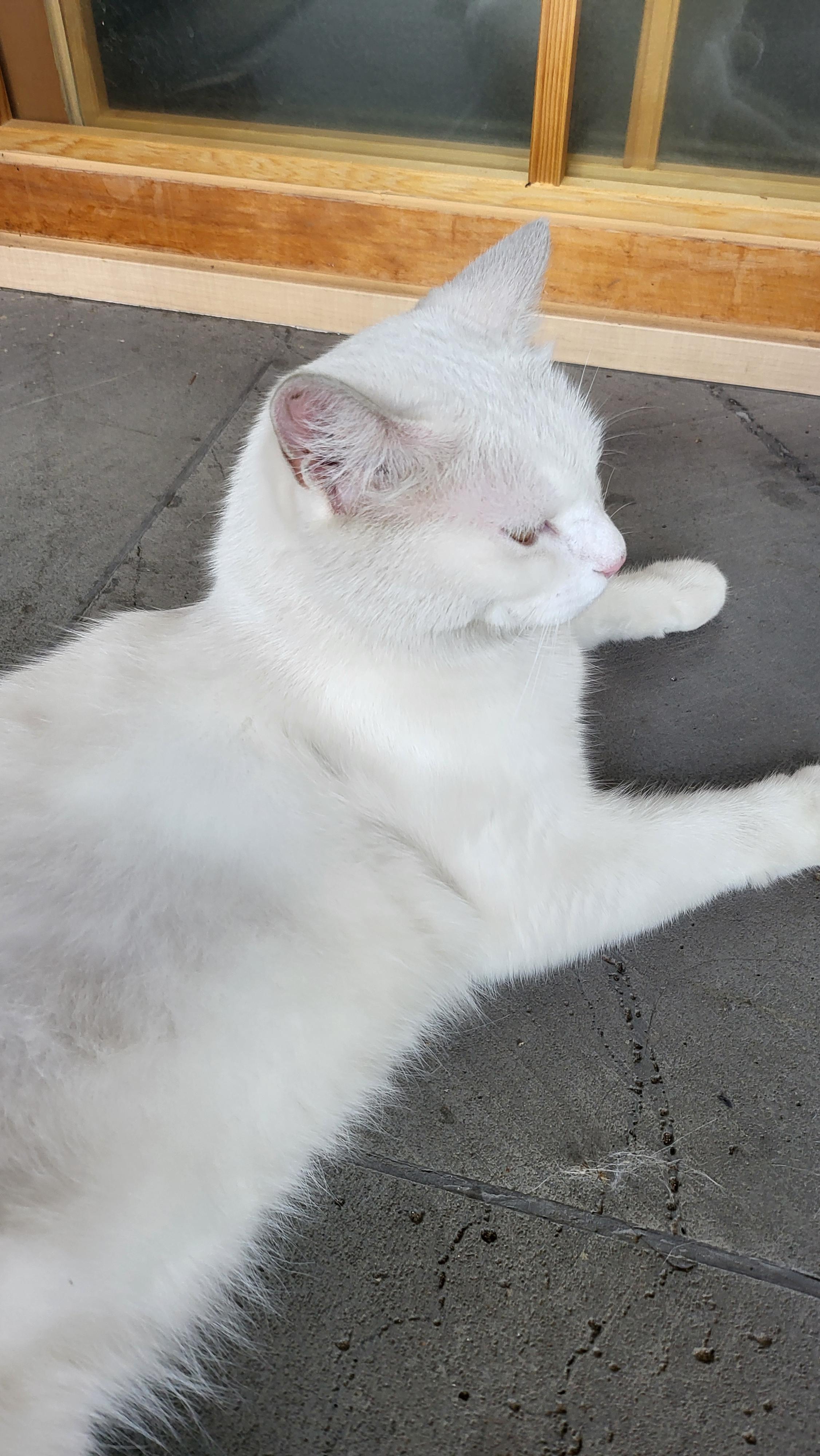 마당에는 하얀 고양이 한 마리가 조용히 쉬고 있었습니다.