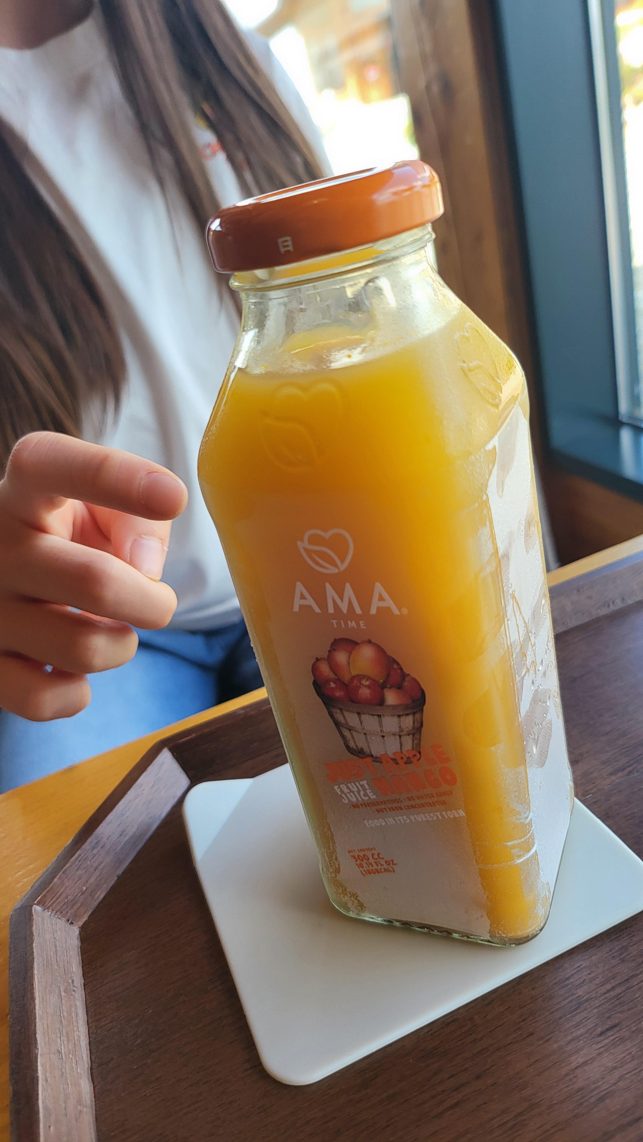 큰딸은 병에 담긴 AMA 망고주스를 마셨는데,