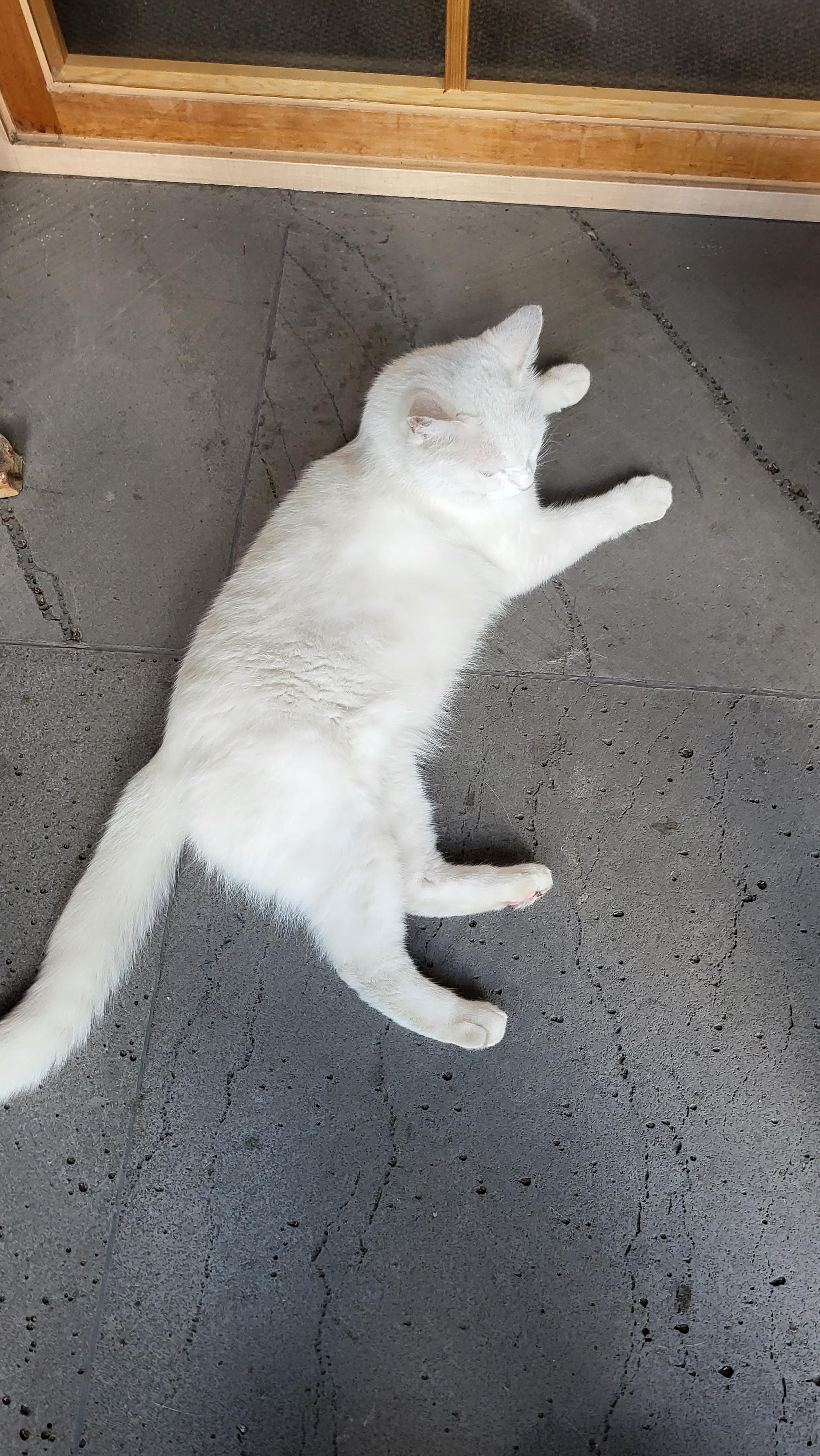 마당에는 하얀 고양이 한 마리가 조용히 쉬고 있었습니다.