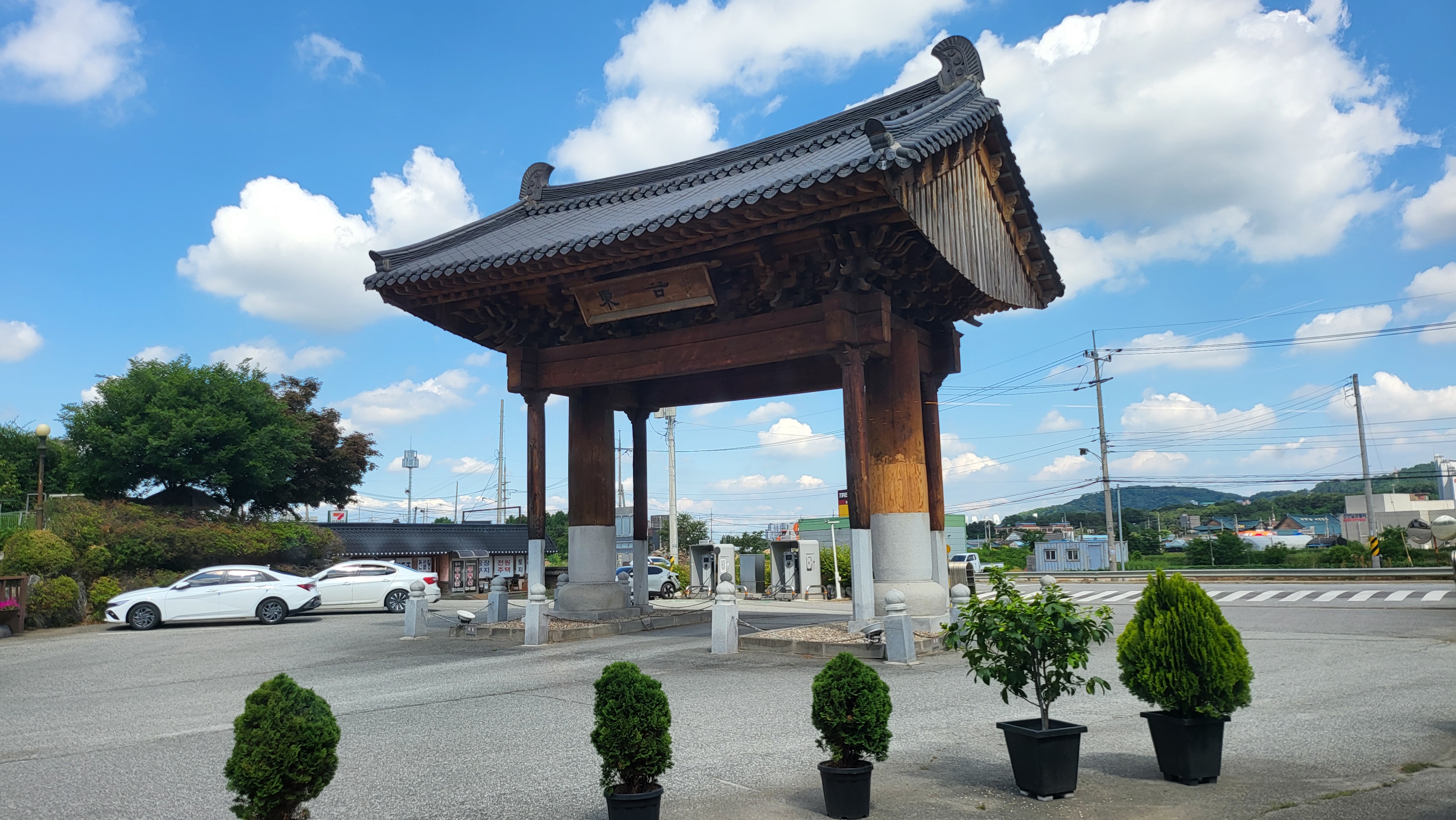 입구부터 전통 한옥 기와지붕과 나무 기둥이 반깁니다.