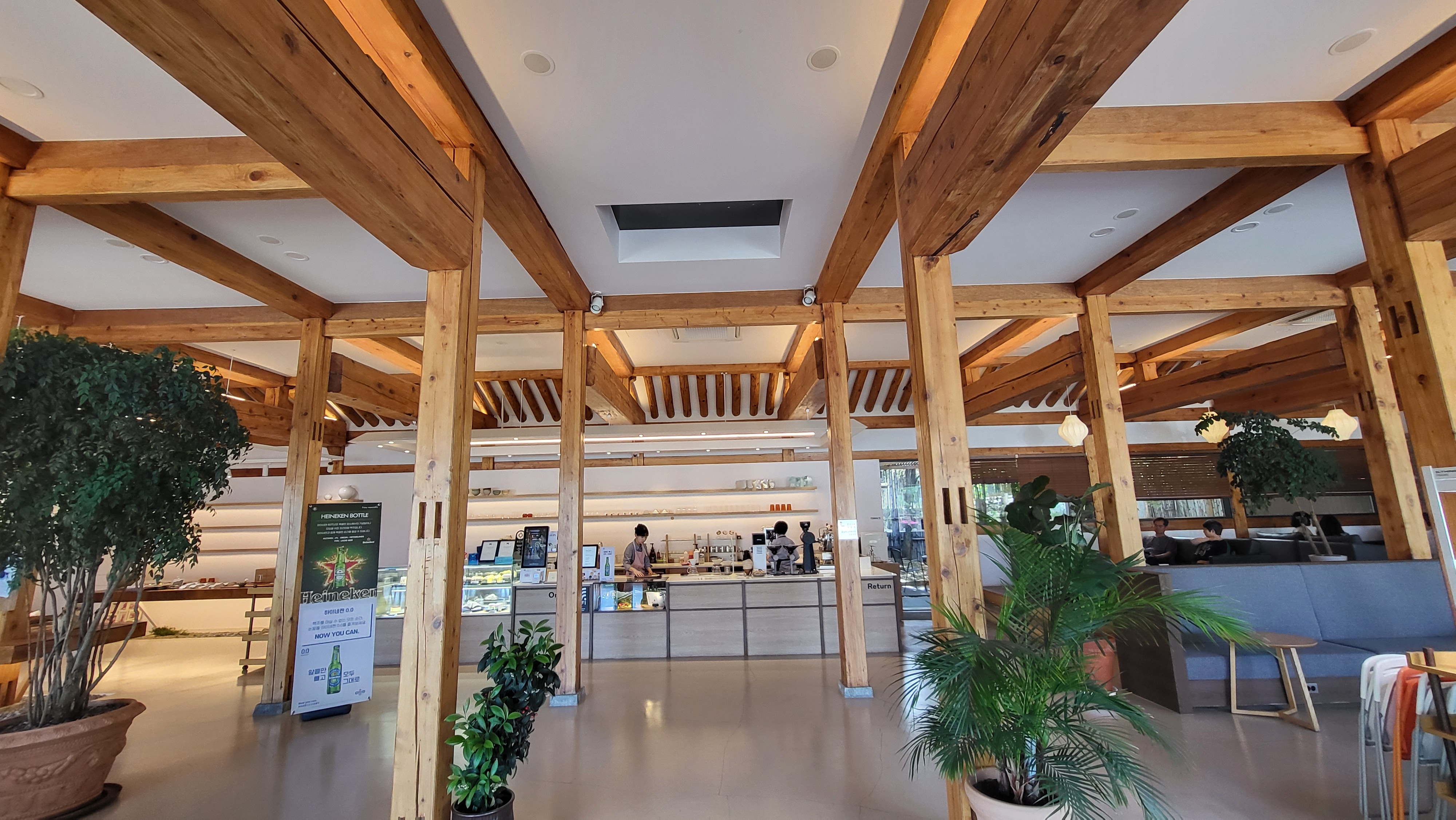 한옥 스타일의 대형 카페인데 내부가 꽤 넓고, 통유리 구조로 탁 트여 있어서 시각적으로도 시원해 보이더라고요.