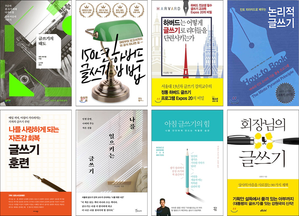 세계 유명 대학에서는 글쓰기 수업이 중요한 커리큘럼 중 하나라고 합니다. 문학적으로 유려하고 매끄러운 글쓰기보다도 논리적으로 실용적인 글쓰기를 잘하는 방법에 대해서 가르치는 추세인 것 같습니다 글쓰기도 배울 수 있다라는 생각이 어느 정도 점점 보편화되고 있는 것 같아요 서점에서 보면 글쓰기에 관한 책들이 꽤 많이 나오고 있는 것을 볼 수가 있습니다 아래에 글쓰기 책들의 예시를 좀 보시죠.