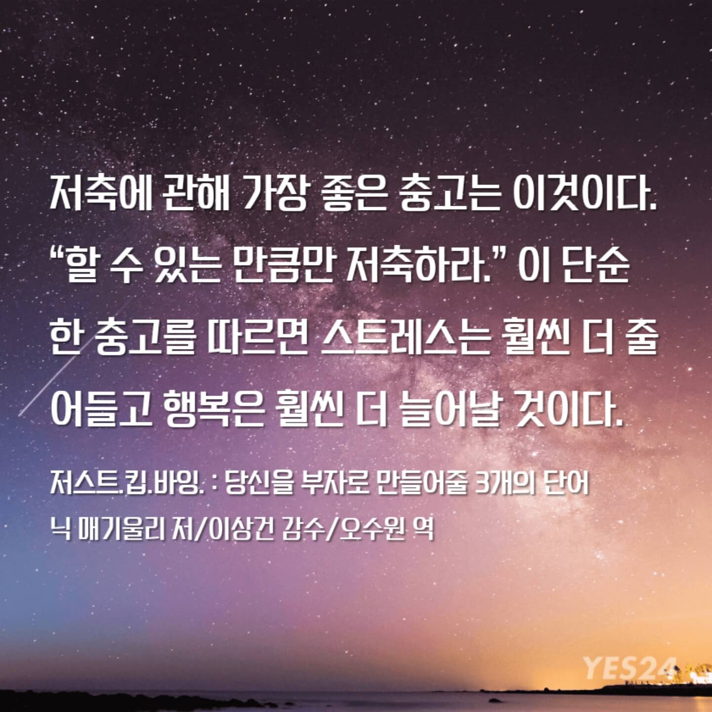저자 역시 이런 부담의 늪에서 헤맨 적이 있었던 것 같습니다. 어느 날 저축에 대한 과도한 강박으로부터 벗어나 "할 수 있는 만큼만 저축하자"라고 생각하게 된 이후로부터, 그때부터 재정적인 결정 하나하나에 의문을 품고 스트레스 받는 일은 없었다고 하는군요.