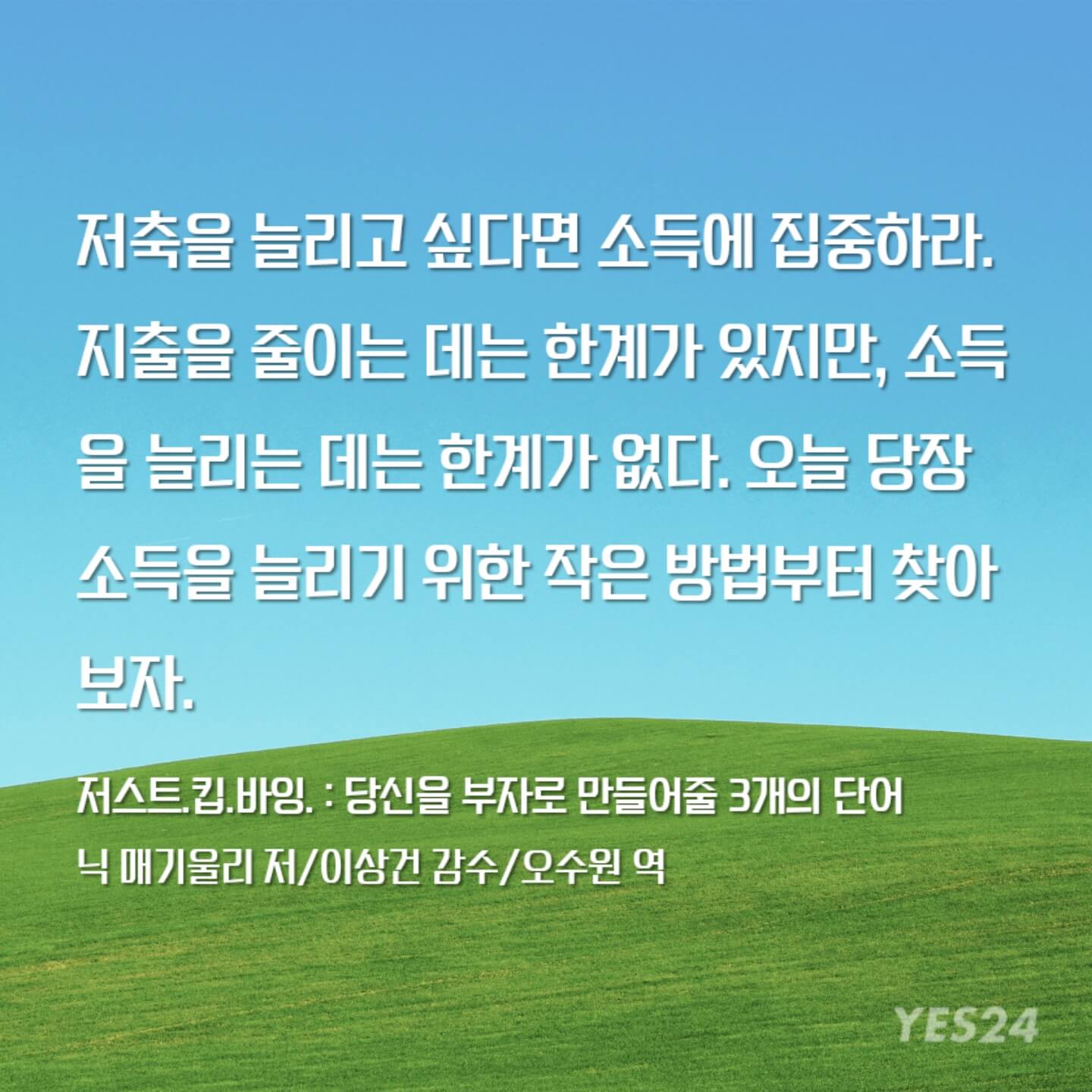 기억에 남는 한 구절을 꼽자면, 지출은 줄이는 데 한계가 있지만 소득을 늘리는 데는 한계가 없다는 가르침이었습니다 최종 목적은 저자의 말대로 사업이나 자산을 소유하는데 집중해야 한다는 것이죠. ^^ 소득을 늘릴 수 있는 방법에 대해서도 연구해서 공유해 볼께요~!