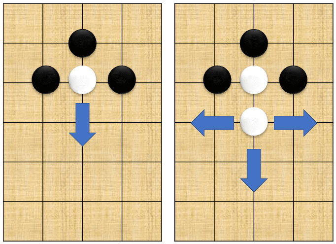 저는 바둑을 잘 모릅니다만, 내 돌 하나가 세 방향에서 포위되면 살아날 수 있는 방법이 단 한 개밖에 없다는 것은 기초 중의 기초이지요. 그런데, 그 상황에서 뚫린 방향으로 이어 주어 활로를 찾게 되면 그 다음에는 살아날 길이 세 방향으로 늘어나게 됩니다.