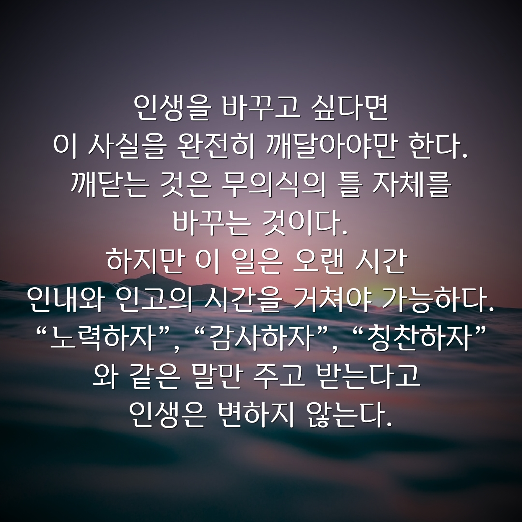 저는 이 책을 읽으면서, 생각의 틀이 되는 무의식을 통제하는 강력한 방법을 배우게 되었습니다. 그건 바로 긍정적인 자기암시의 습관화입니다. 의식적으로는 좋은 말을 가끔 해 주는데 무의식적으로 부정적인 생각을 지속하는 사람들이 있습니다. 저도 그 중 하나였고요. 예를 들면 "씁..안되겠다" 또는 "큰일났네", "죽겠다", "안될걸" 같은 말을 무의식적인 추임새로 넣는 경우가 많이 있지요. 의식하지 못할 때 듣는 말과 하는 생각들이 축적되어 잠재의식의 틀을 형성한다고 합니다.