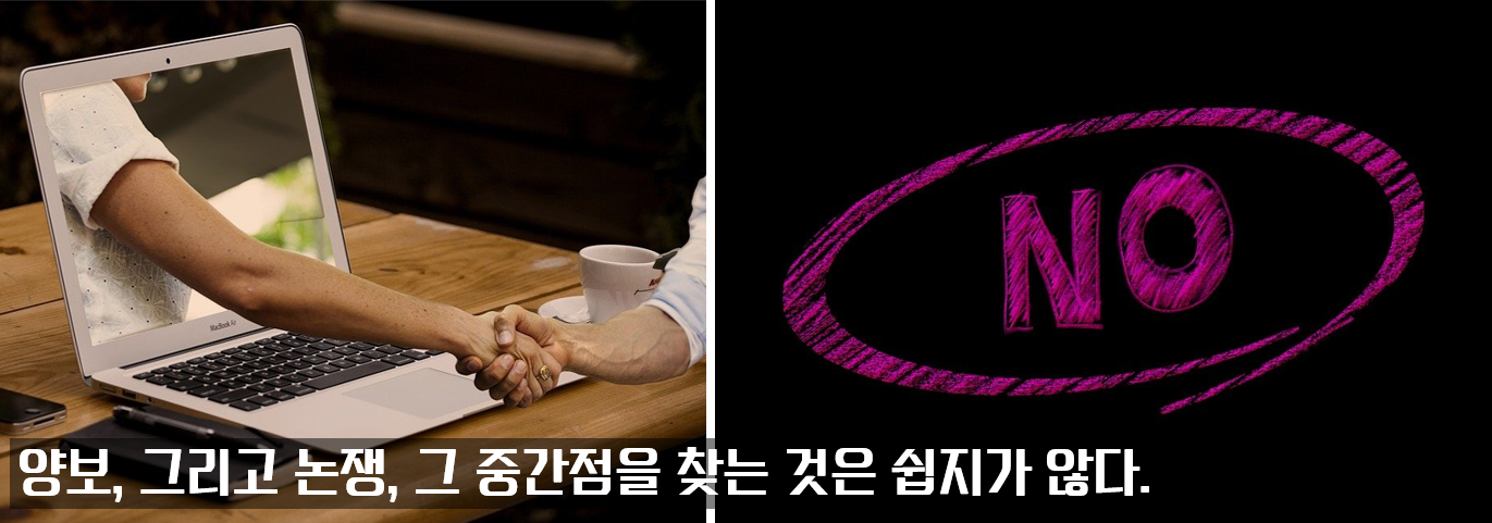 협업에서 양보는 미덕이지만, 합리적 논쟁은 필수인 것 같습니다. 팀워크를 위해서 분위기 해치기 싫으니까 논쟁을 피하는 스탠스가 정말 바람직한 것일까 하는 생각이 듭니다. 친밀감이 업무에 미치는 영향이 없지는 않으나, 일은 친밀감으로 돌아가는 게 아니라 "역할"에 의해 돌아가는 것이죠. 어떤 경우에도 싸우지 않겠다는 마음가짐이 있는 사람은, 경우에 따라서는 얼마든지 논쟁할 수도 있다고 생각하는 사람에게 반드시 당하는 게 세상 이치인 것 같습니다.